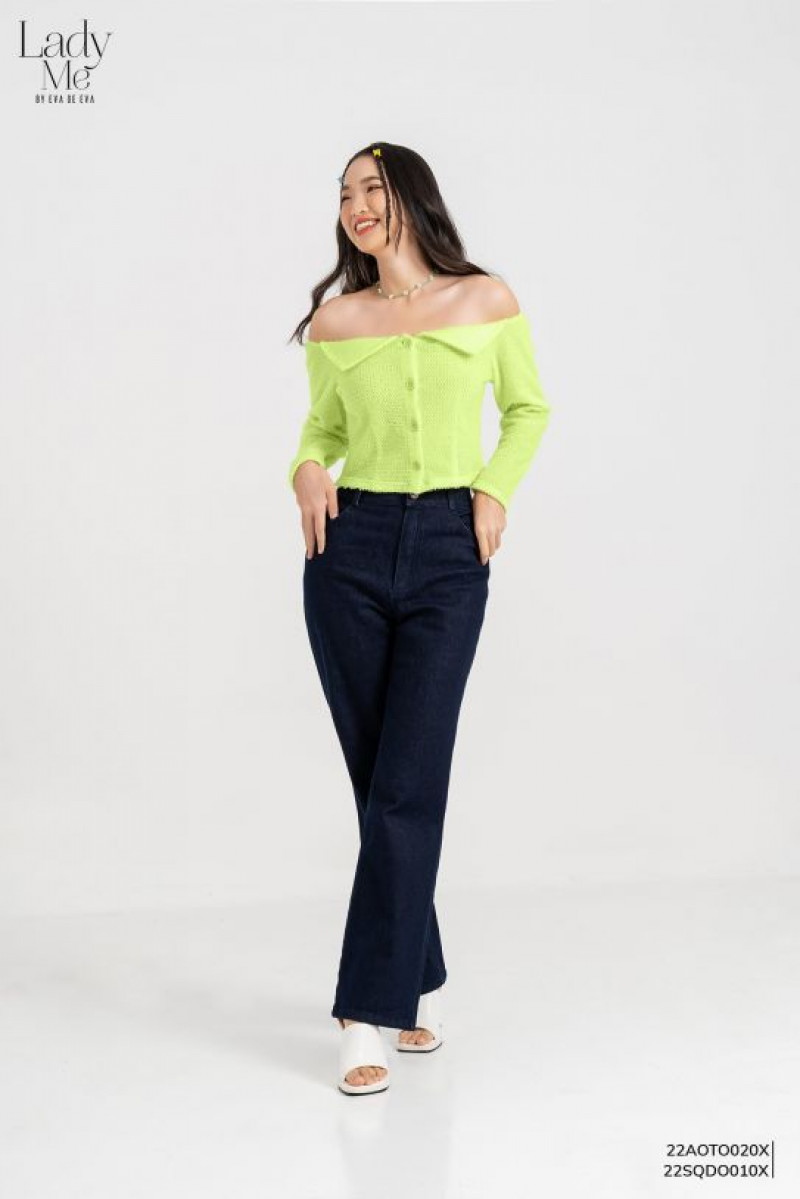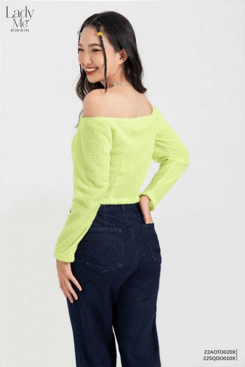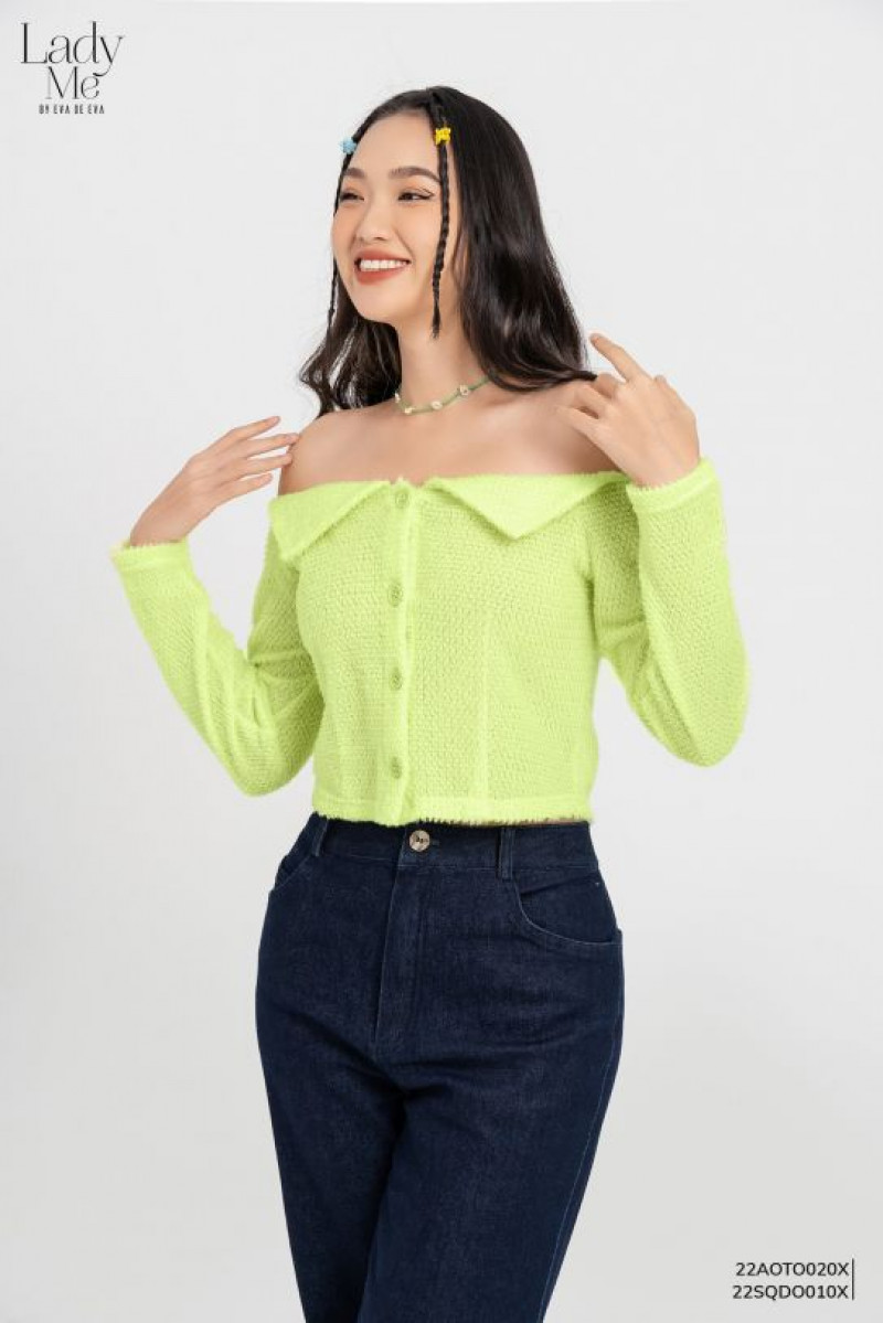 Áo trễ vai dài tay dáng ôm màu xanh, cúc trang trí thân trước.Màu sắc: Xanh