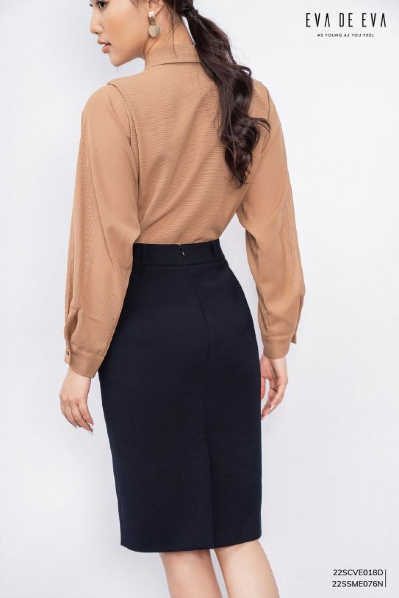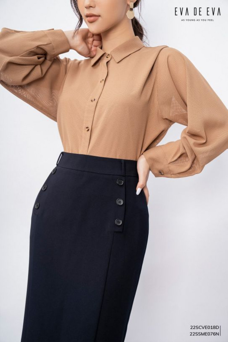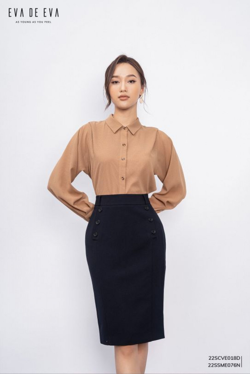 Chân váy phom dáng bút chì, chi tiết 2 hàng cúc trang trí.