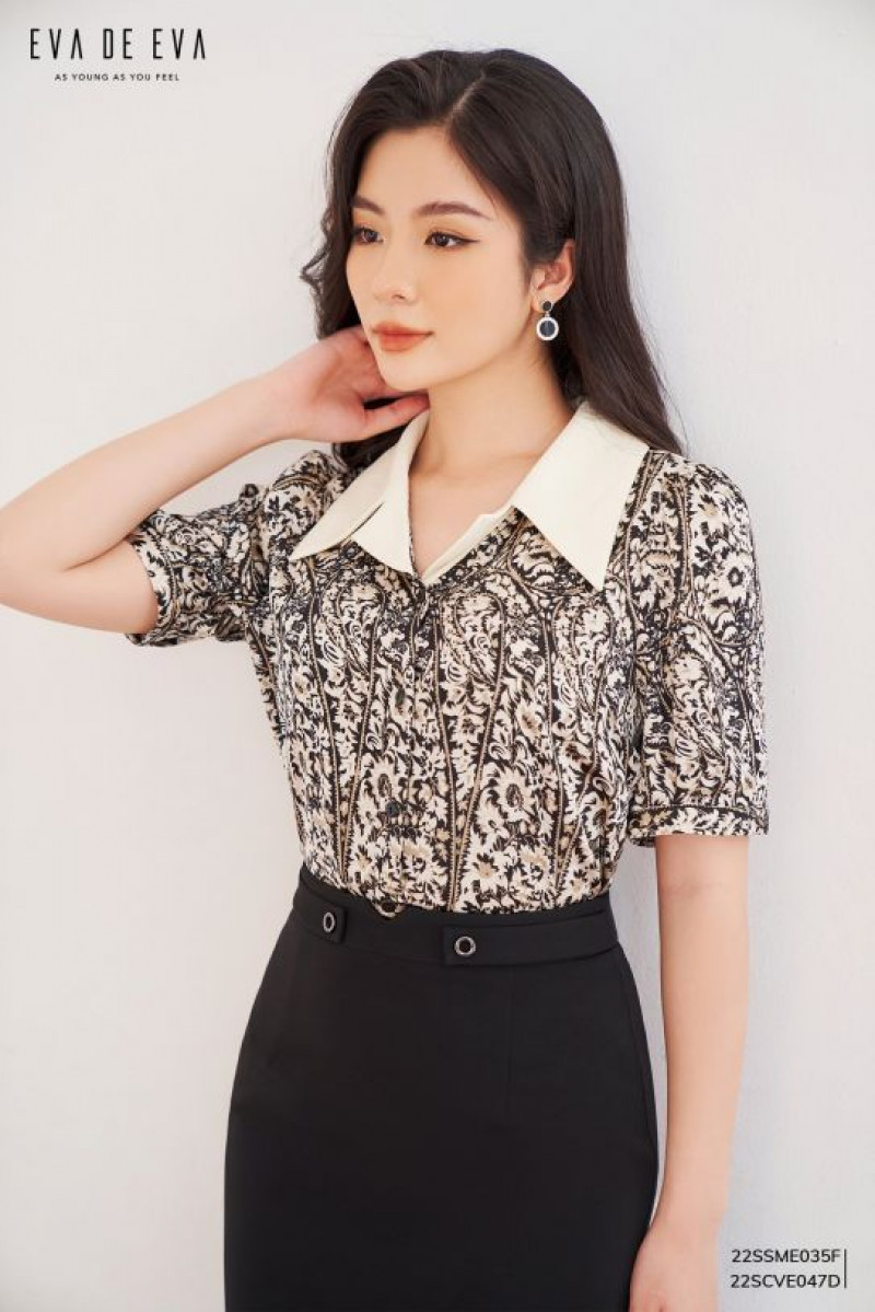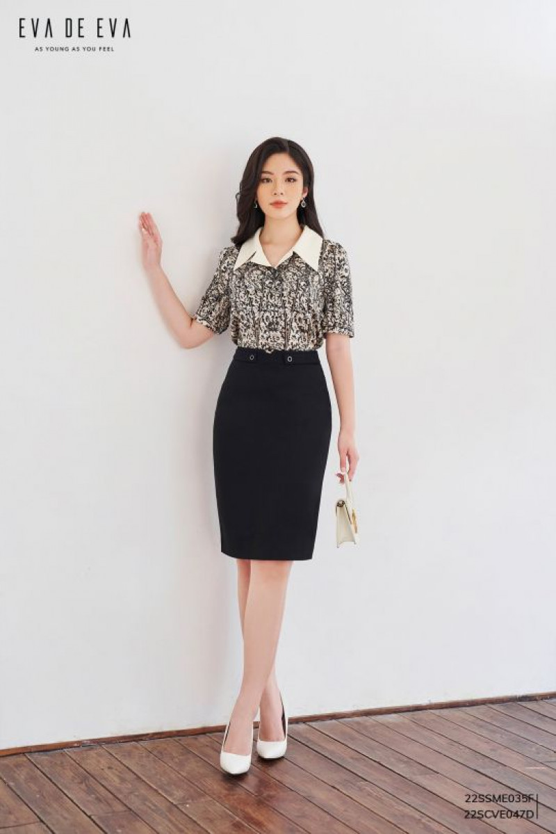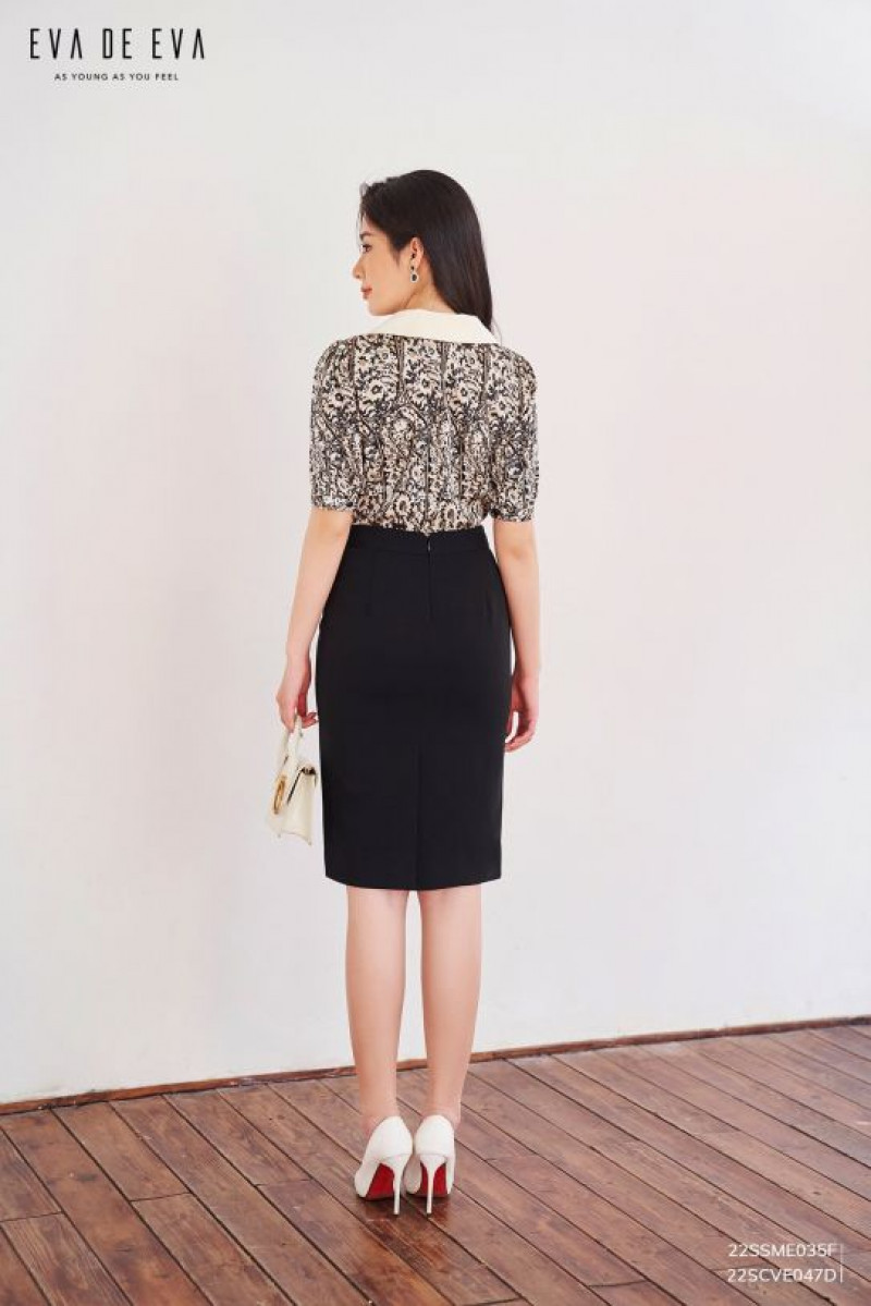 Chân váy ngang gối, phom dáng ôm, cạp có điểm nhấn kim loại trang trí.Màu sắc: Đen