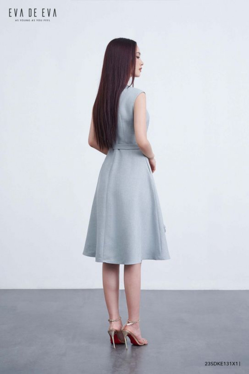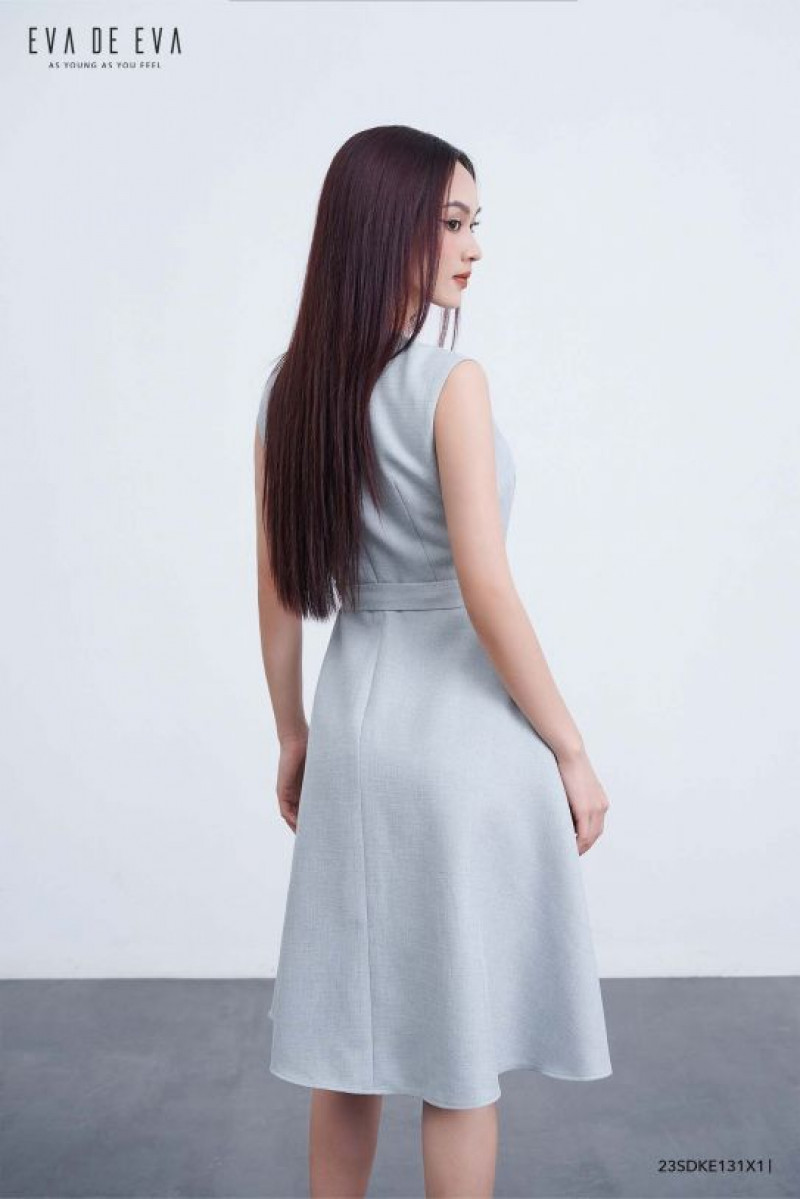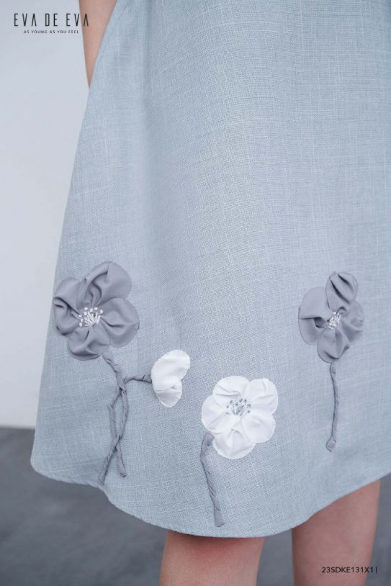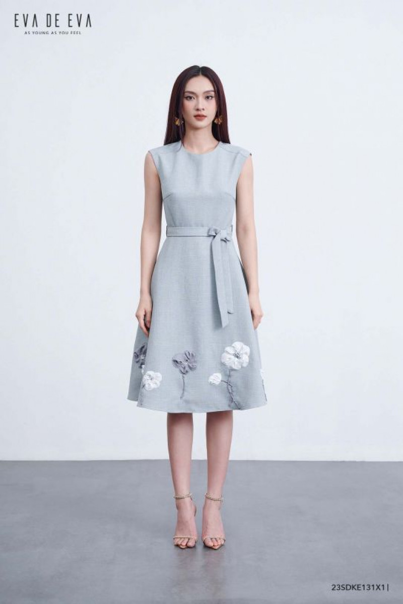 Đầm sát nách, dáng thắt eo, chi tiết hoa đắp 3D cắt nhiệt tạo nổi trên bề mặt vải, kéo khóa sau.