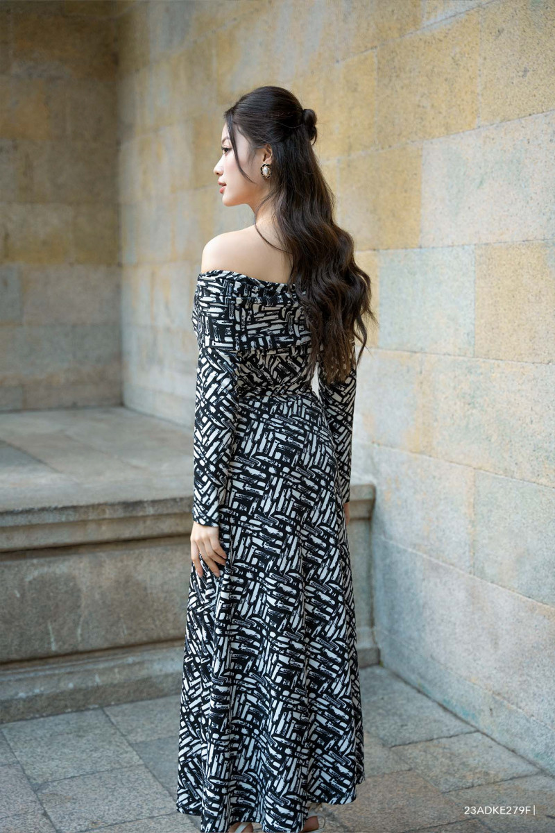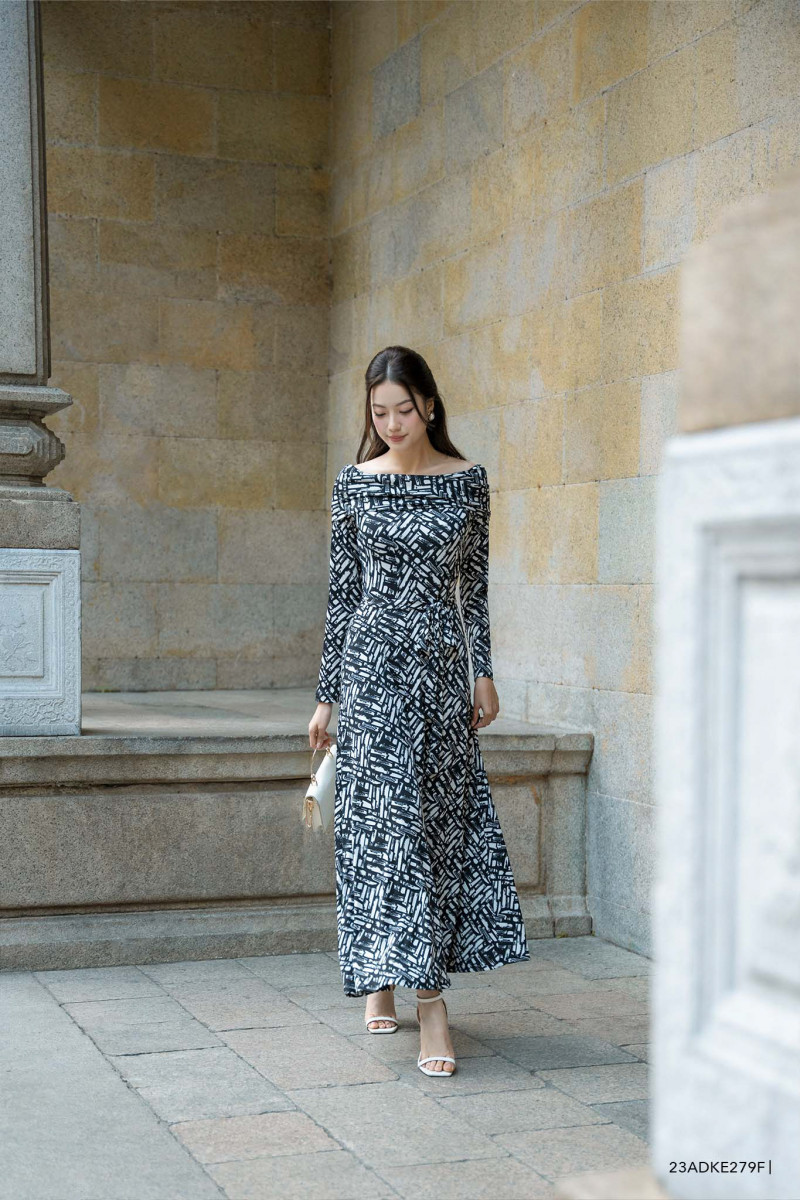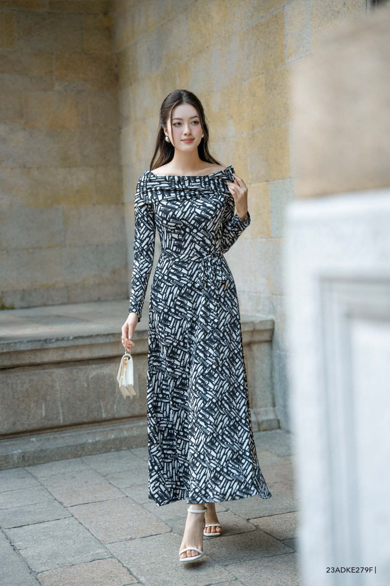 Đầm tay dài, cổ cách điệu, họa tiết nổi bật