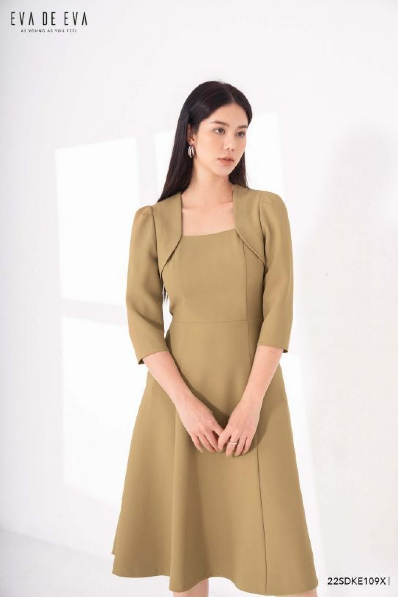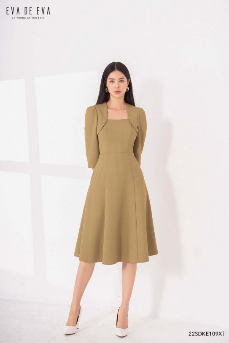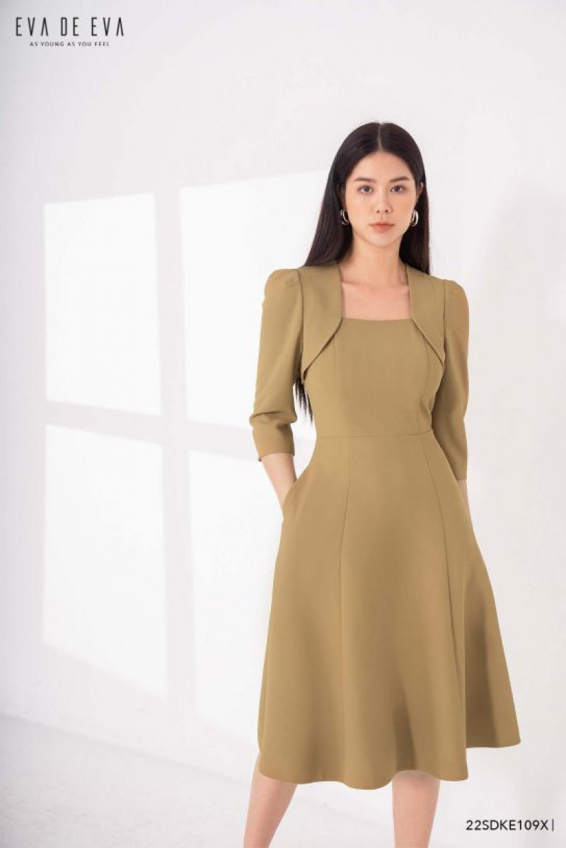Đầm tay lỡ, dáng thắt eo, cổ bẻ vuông, phom dáng xoè mềm mại.Màu sắc: Xanh