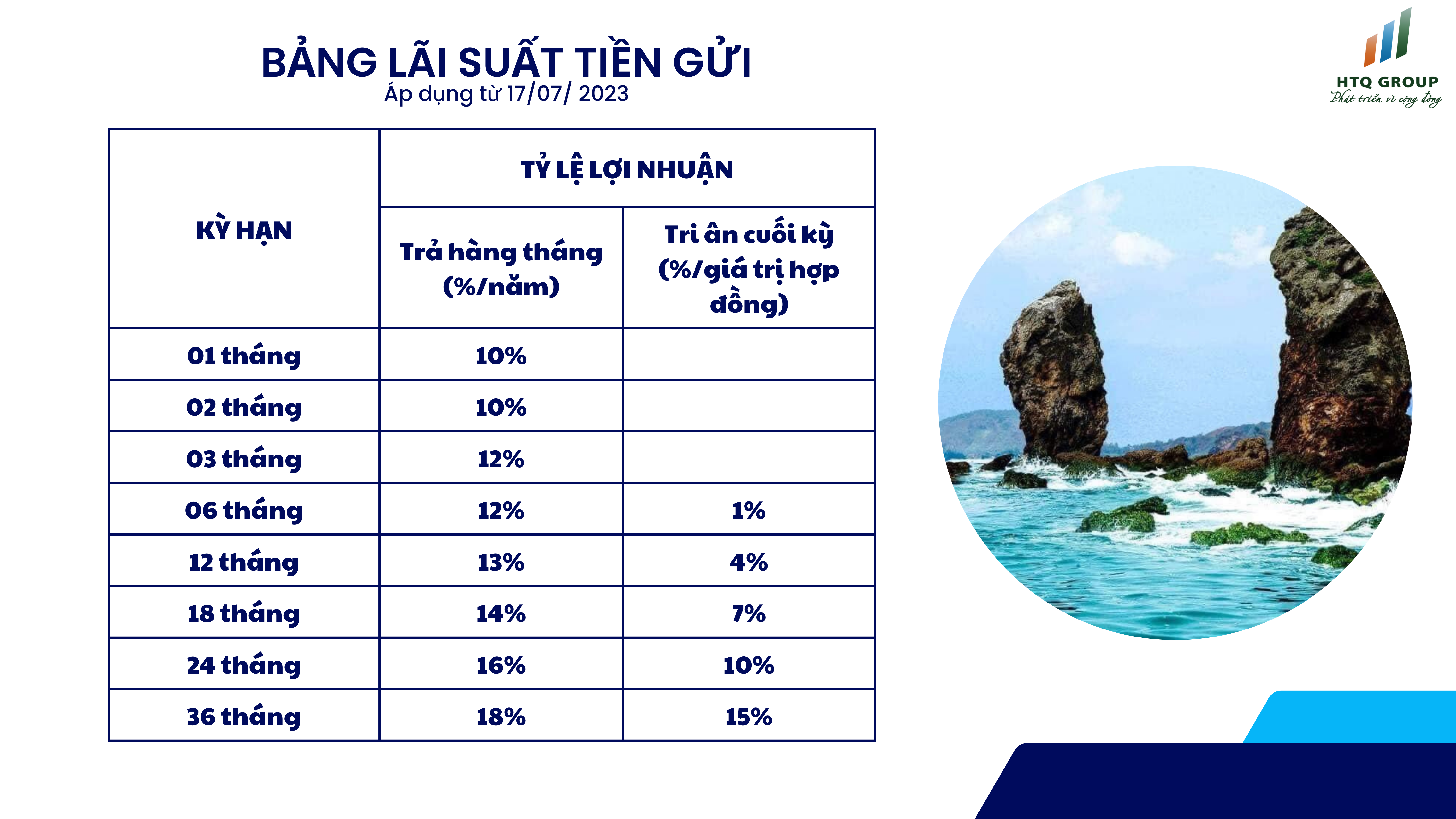 HTQ mang đến sản phẩm tiền gửi có kỳ hạn, mức lãi suất vô cùng hấp dẫn và đặc biệt tri ân cuối kỳ dành riêng cho các nhà đầu tư. Với kỳ hạn linh hoạt từ 1 tháng đến 36 tháng giúp cá nhân tối ưu hóa khả năng sinh lời của nguồn vốn.