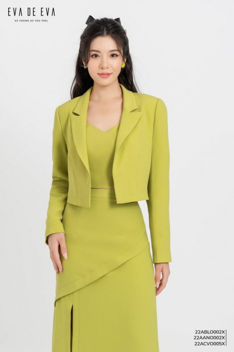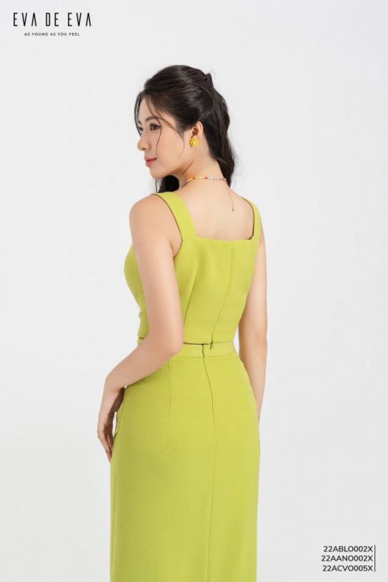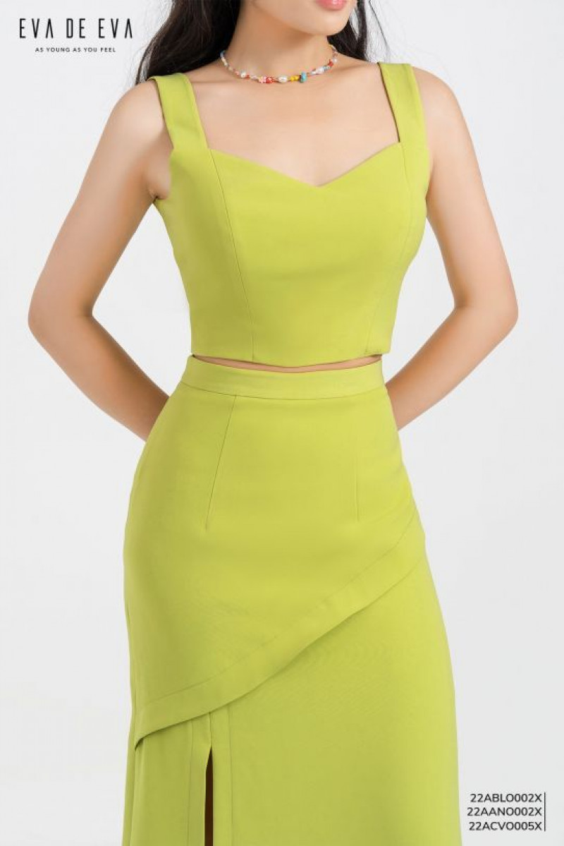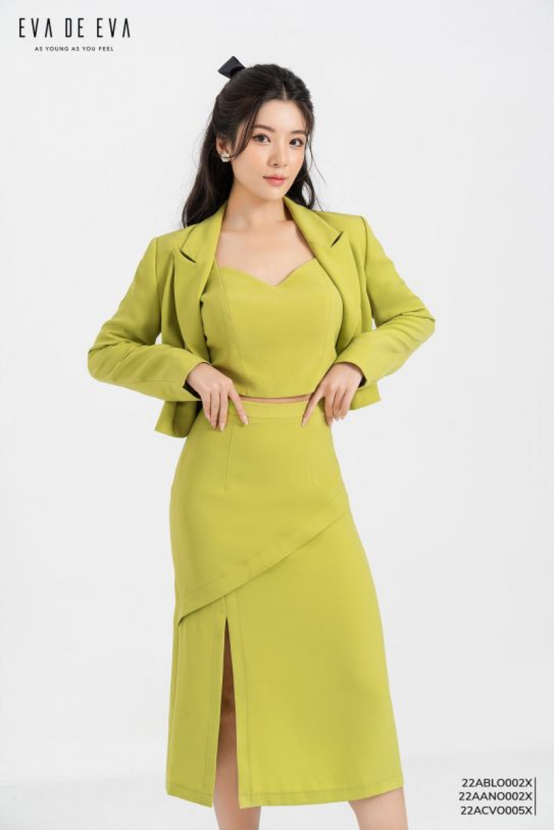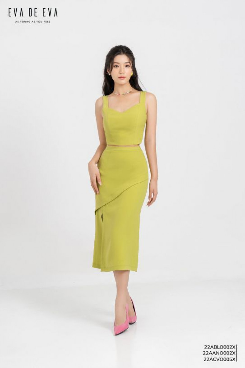 Chân váy midi phom dáng A suông nhẹ, có đường xẻ giữa tạo điểm nhấn.