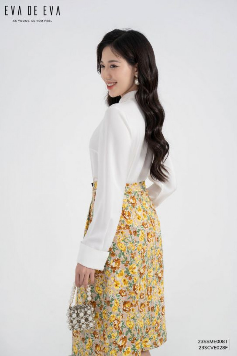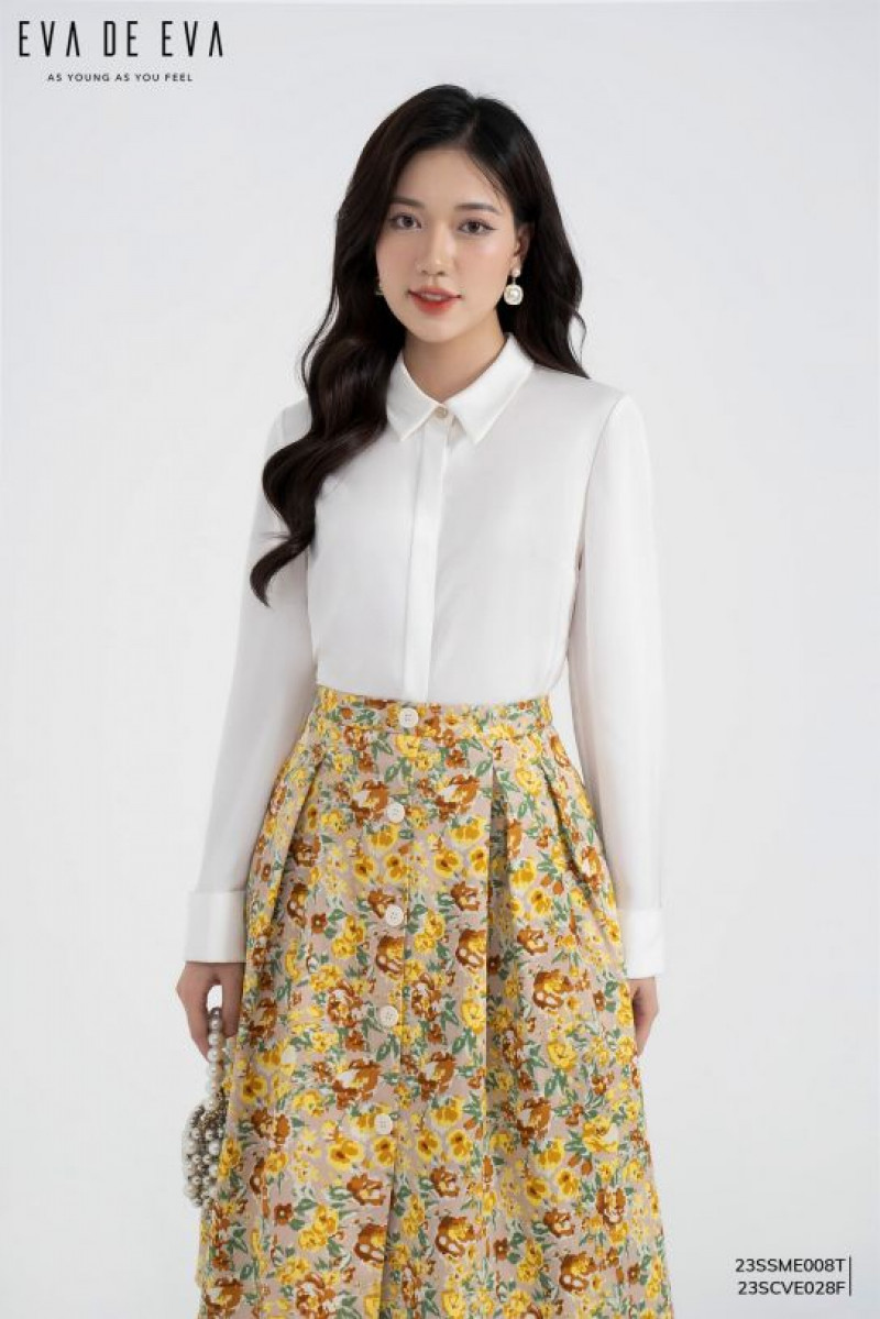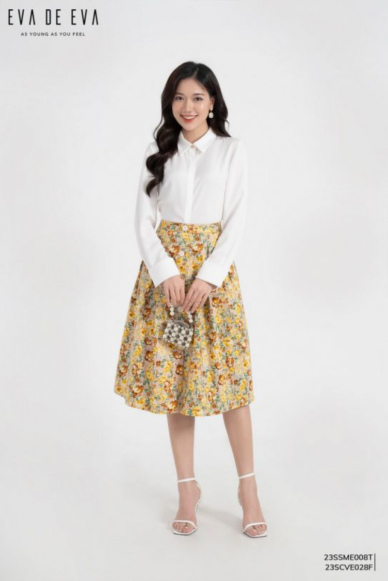 Chân váy Midi, phom dáng xòe trẻ trung, họa tiết nổi bật