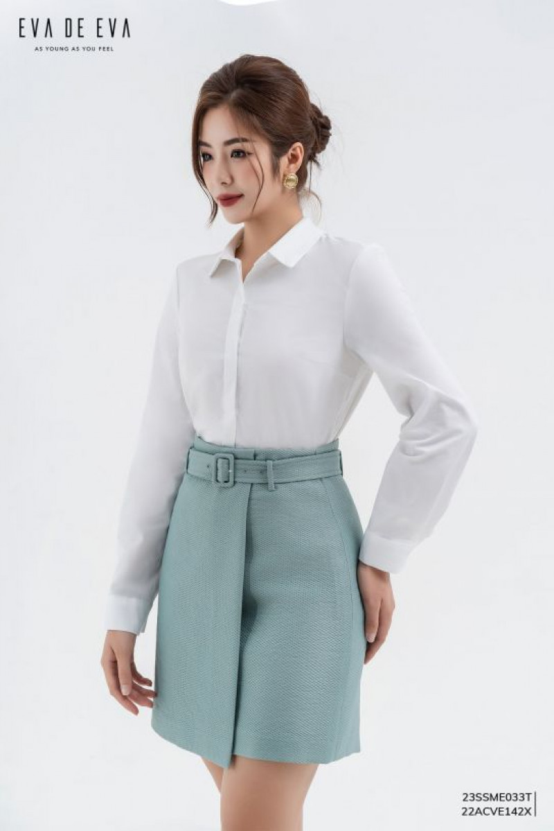 Chân váy midi dáng A, có lót bên trong, vạt xếp chồng, đai trang trí.Màu sắc: Xanh