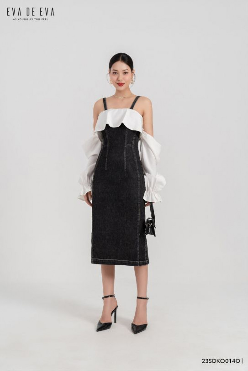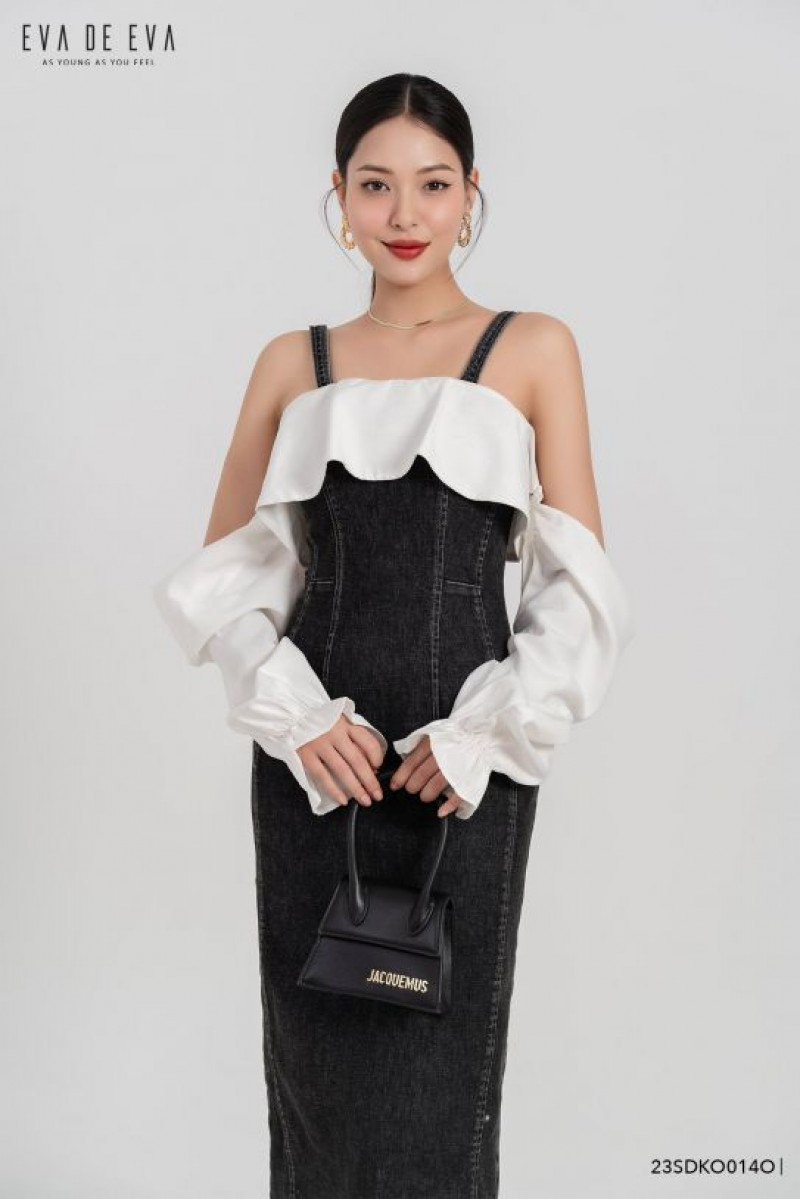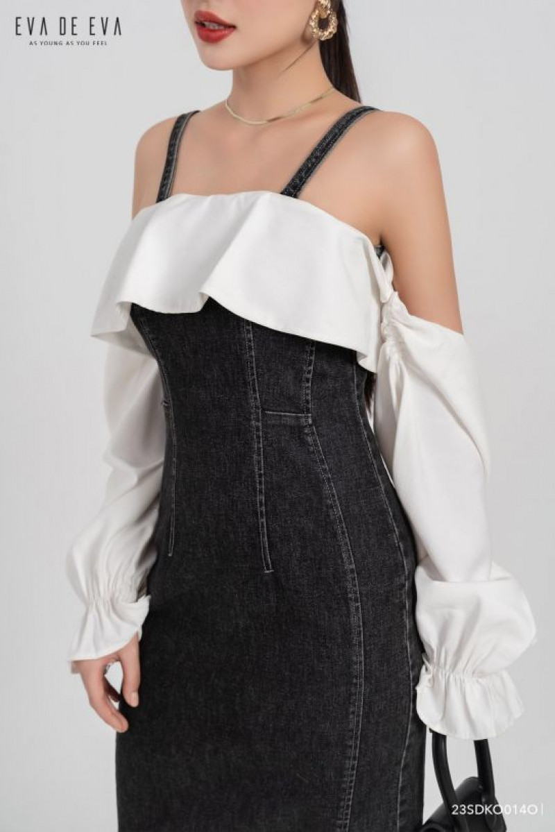 Đầm trễ vai denim dáng ôm trang trí bèo, phối tay bồng nữ tính