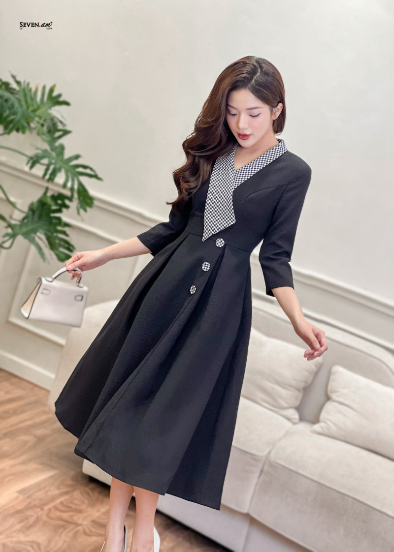 SKU: Đầm xòe tay lỡ text đen kim tuyến cổ bẻ vạt lệch seven.am+s+den