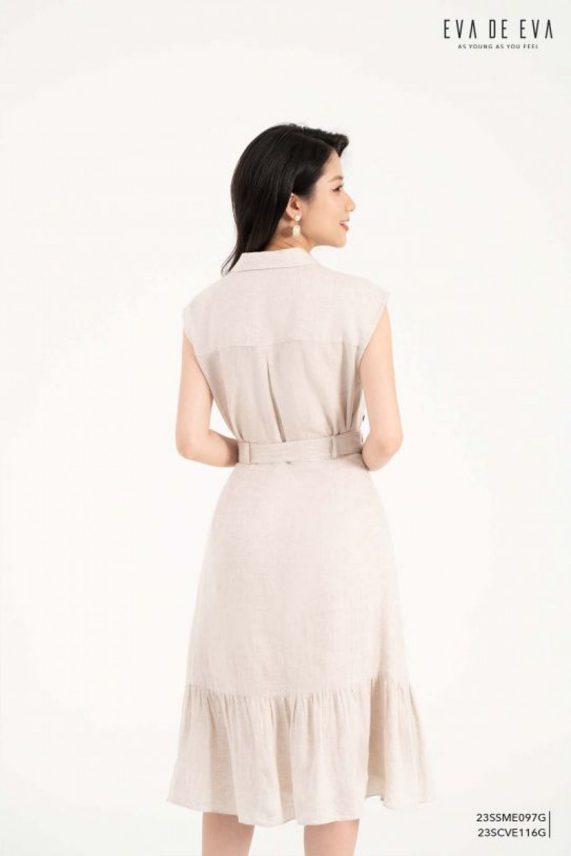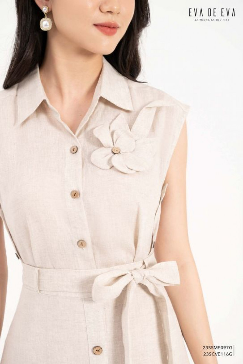 Áo sơ mi sát nách, có chi tiết hoa đính to bản lệch trước ngực tạo điểm nhấn