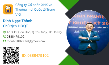 CEO Đinh Ngọc Thành sinh ngày 06/01/1983, hiện đang cư trú tại Hà Nội, là doanh nhân làm việc trong lĩnh vực vận tải, xuất nhập khẩu hàng hóa. Hiện anh đang là Chủ tịch HĐQT Công ty Cổ phần XNK và Thương mại Quốc tế Trung Việt.