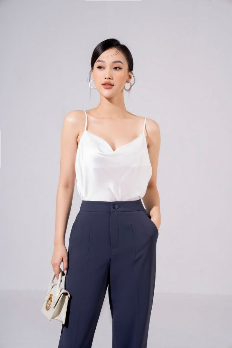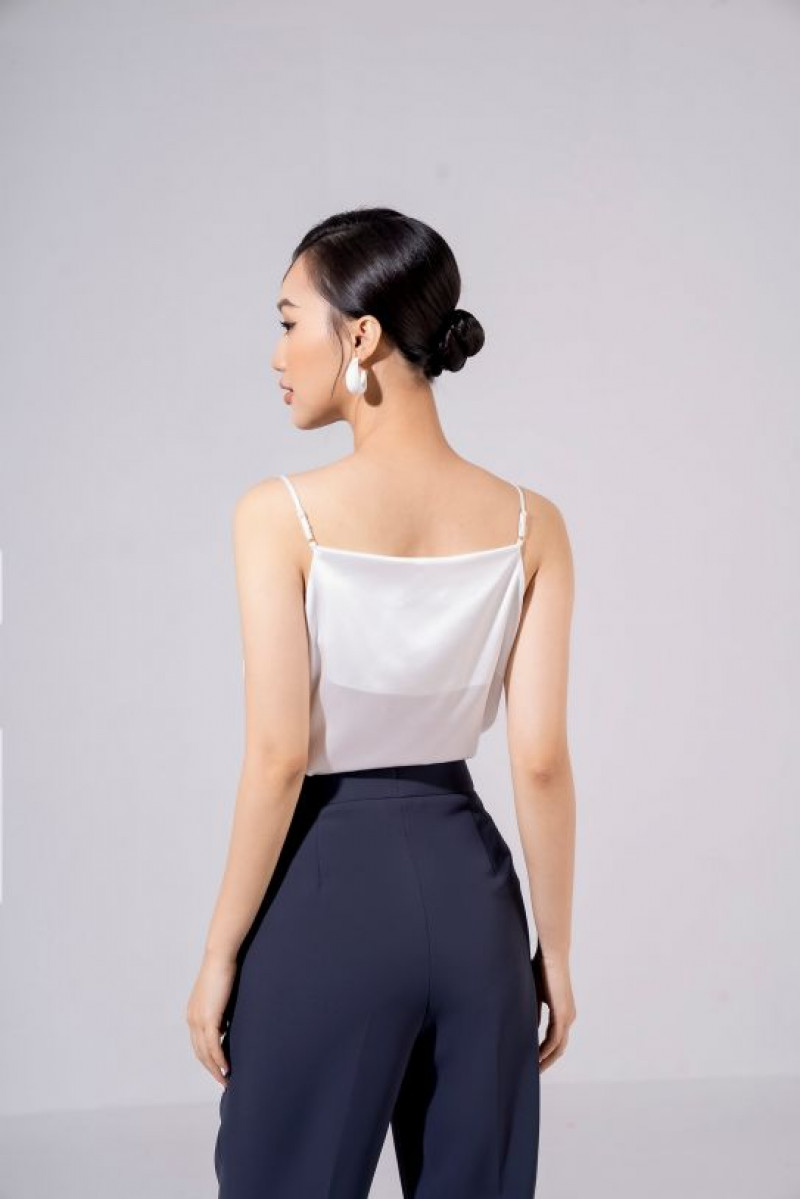 Áo hai dây lụa cao cấp, cổ đổ, kết hợp cùng áo blazer.