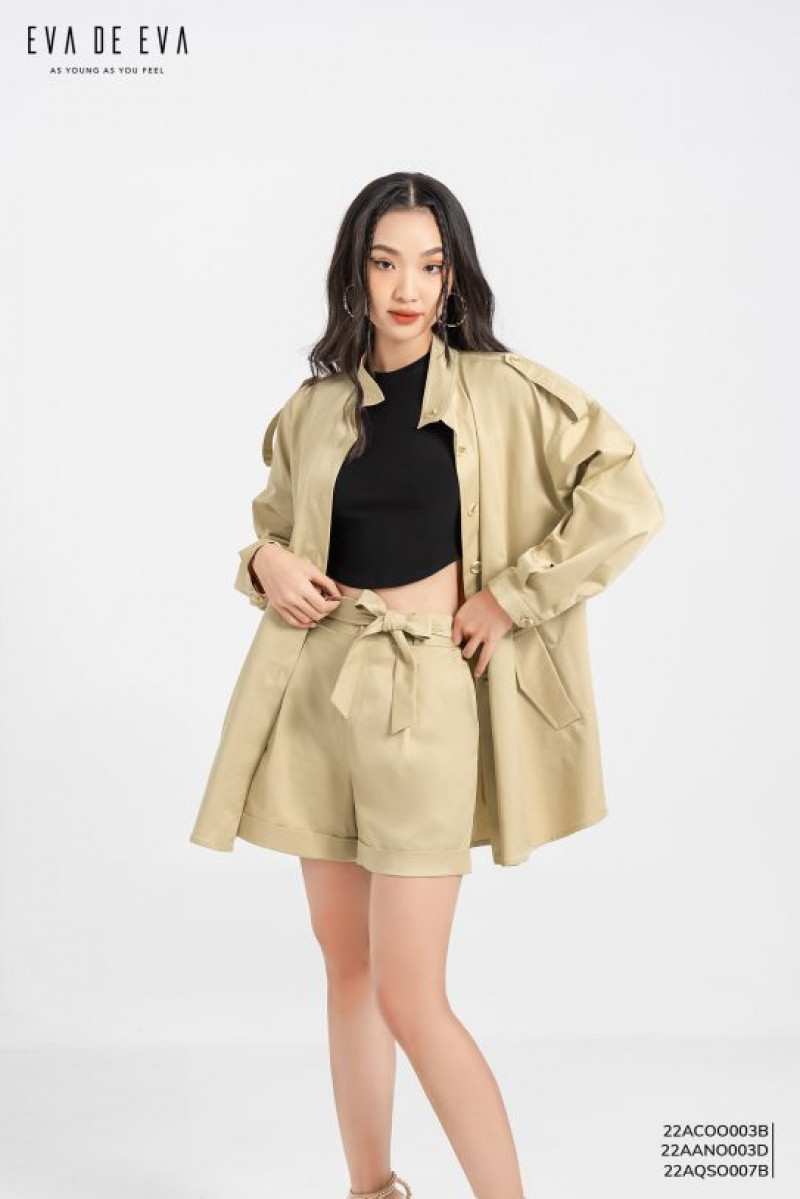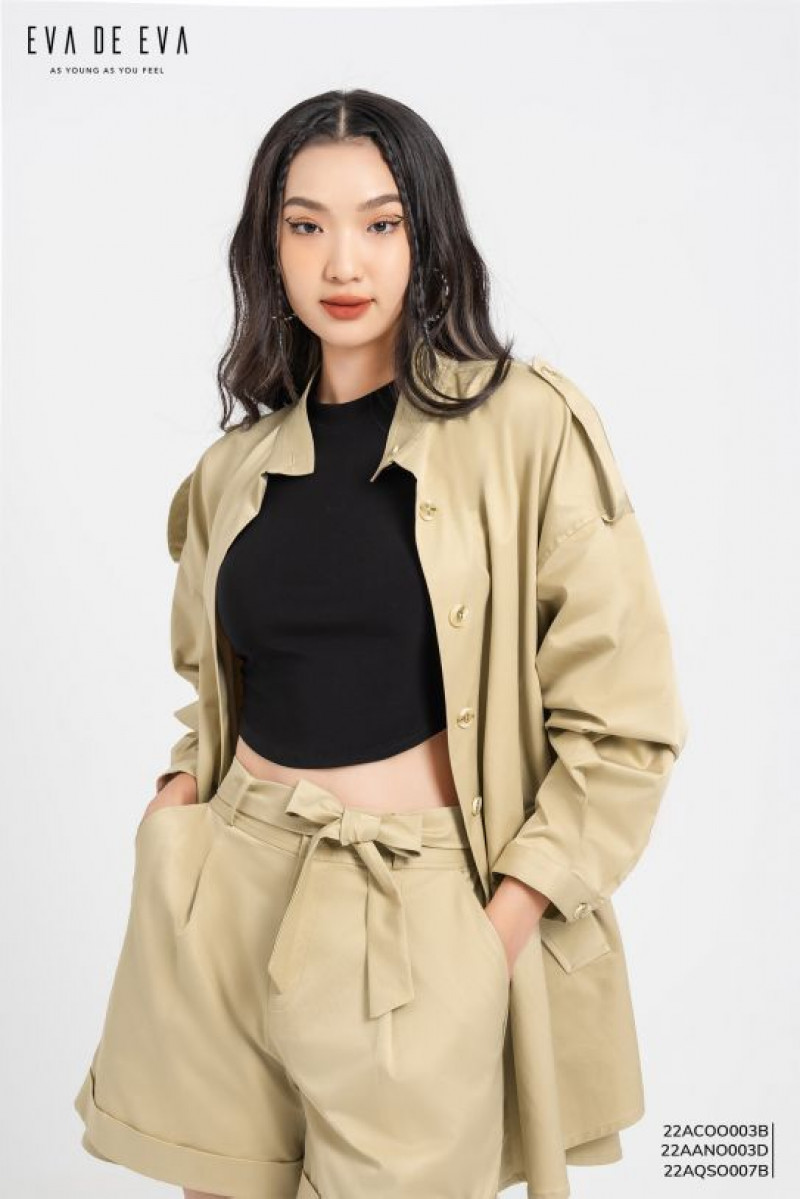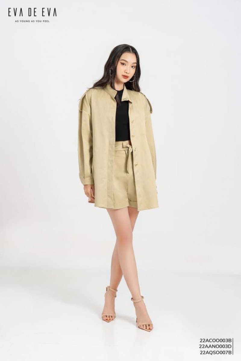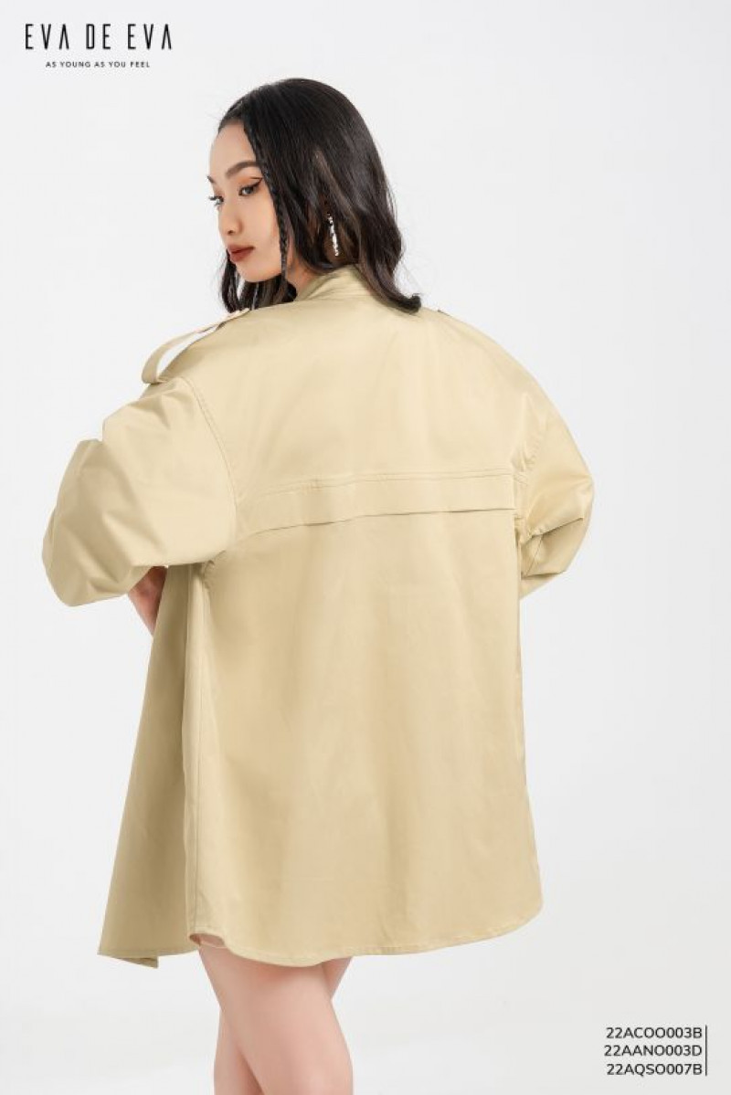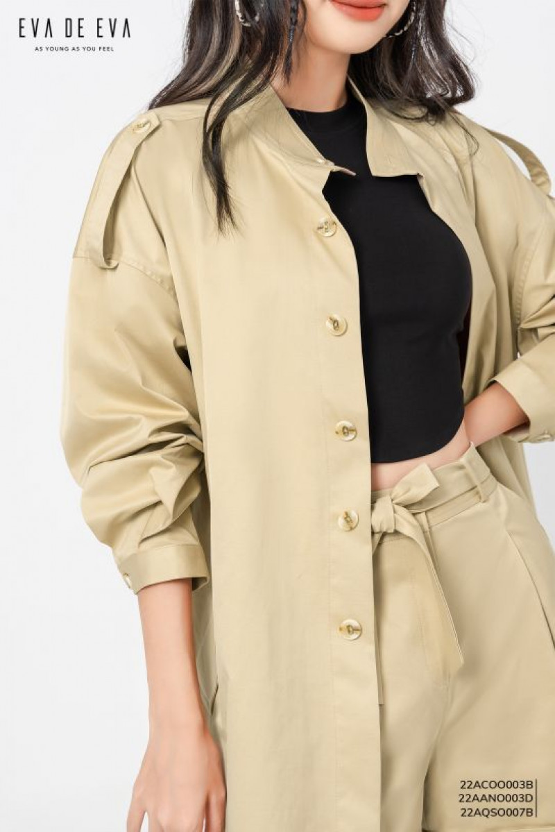 Áo khoác dài tay dáng suông rộng, màu be, cổ tàu 3 phân, 2 túi chéo, gấu áo lượn đuôi tôm, nẹp cúc trước.Màu sắc: Be