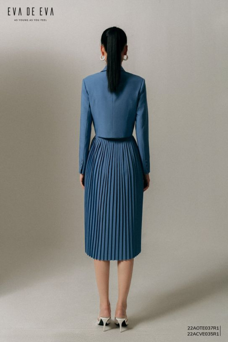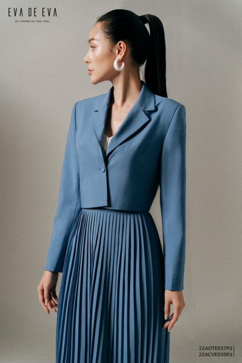 Áo khoác dáng croptop màu xanh, cổ bẻ 1 hàng cúc.