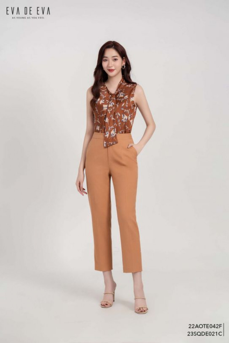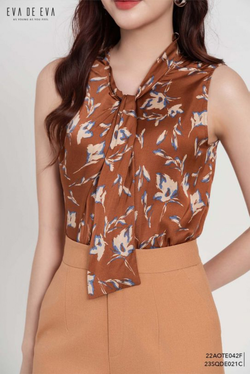 Áo kiểu dáng sơ vin, sát nách, chi tiết cổ vắt giả khăn.