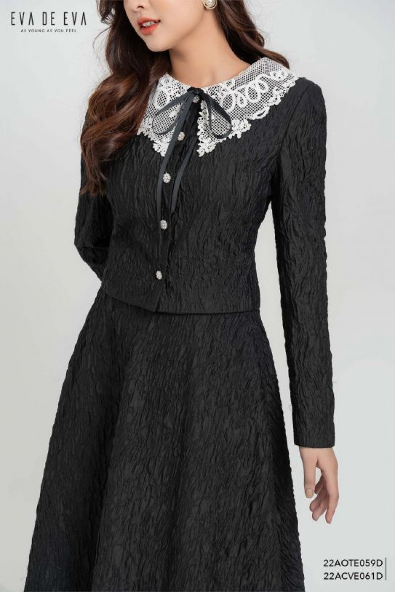 Áo khoác với phần chi tiết là cổ phối ren bản to, thắt nơ ruy băng ở phần tay.