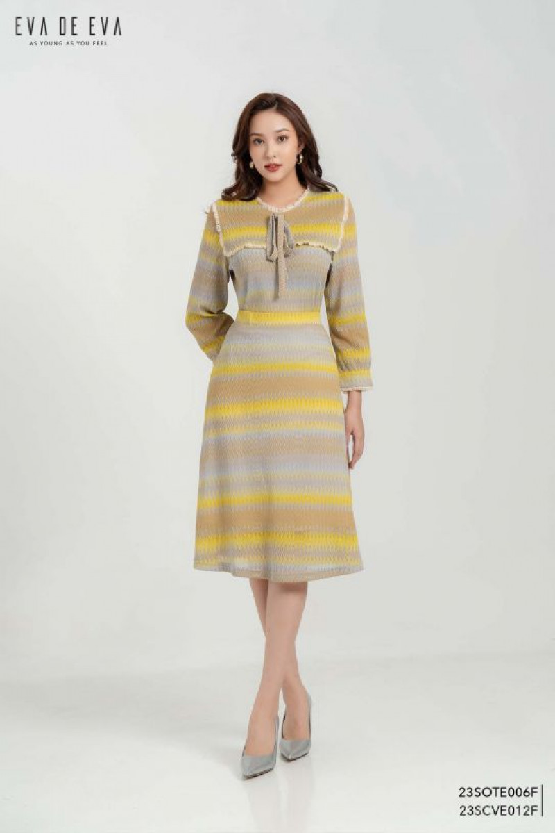 Áo kiểu cổ nơ bổ trụ, tay lửng, họa tiết kẻ.