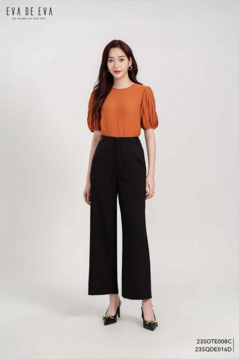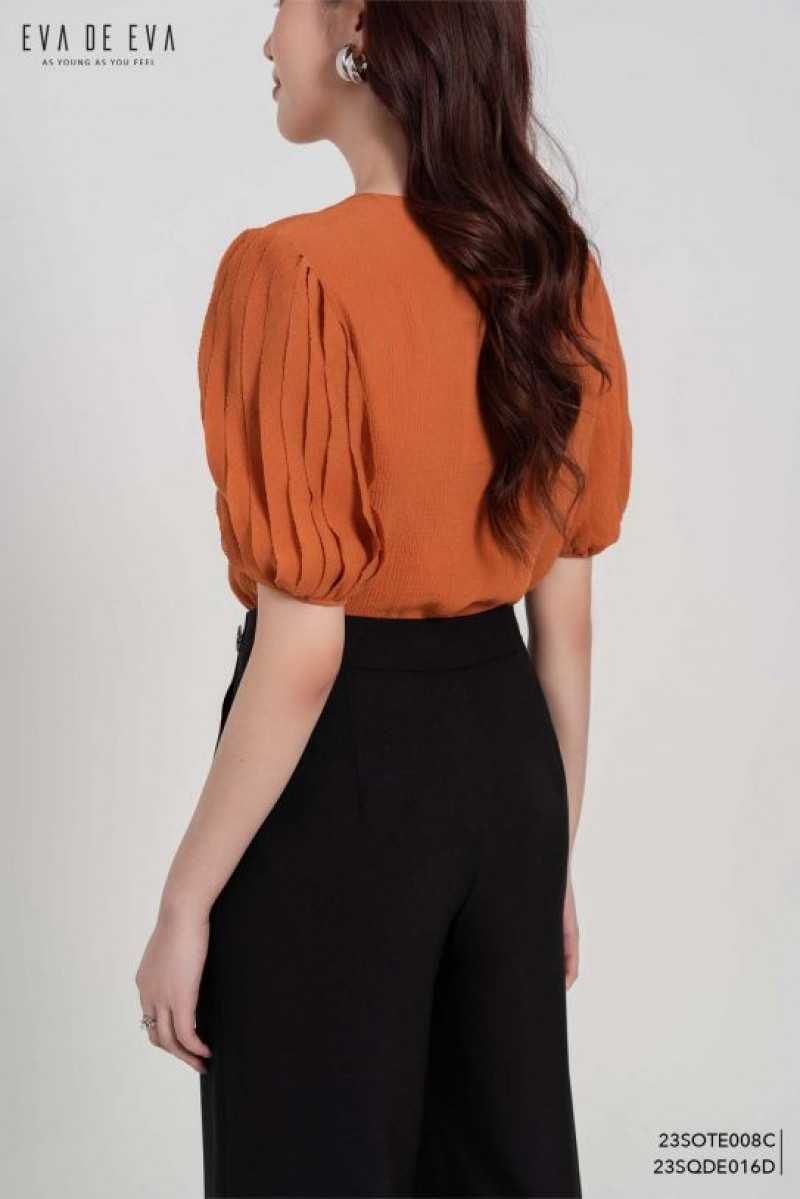 Áo kiểu dáng sơ vin, cổ tròn, tay ngắn kẹp bèo trang trí.Màu sắc: Cam