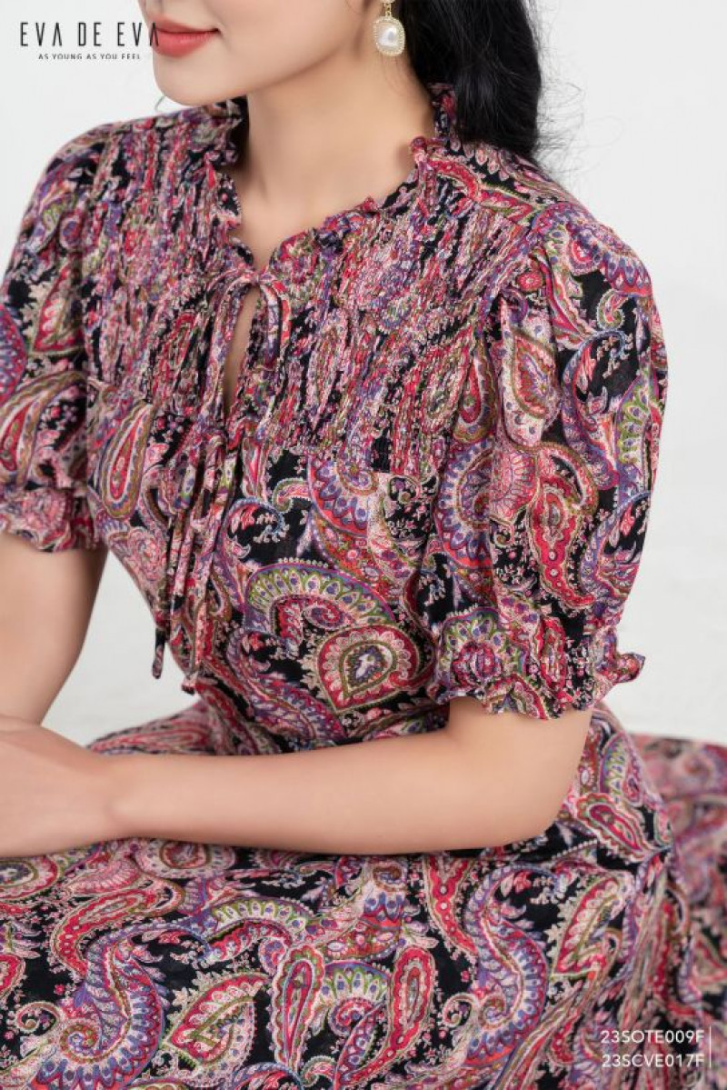 Áo kiểu cố tròn bèo thắt dây nơ, tay bồng nhún nhẹ cửa tay.