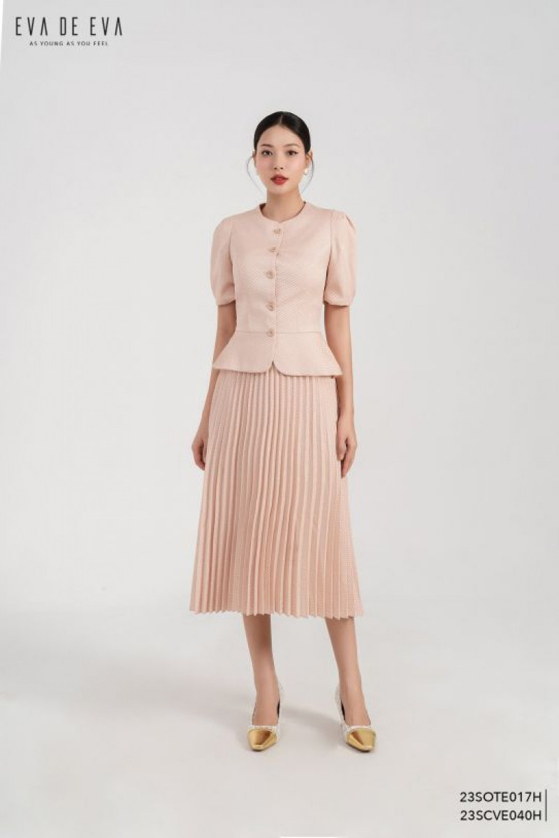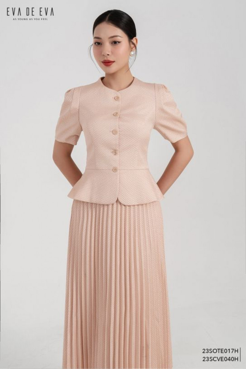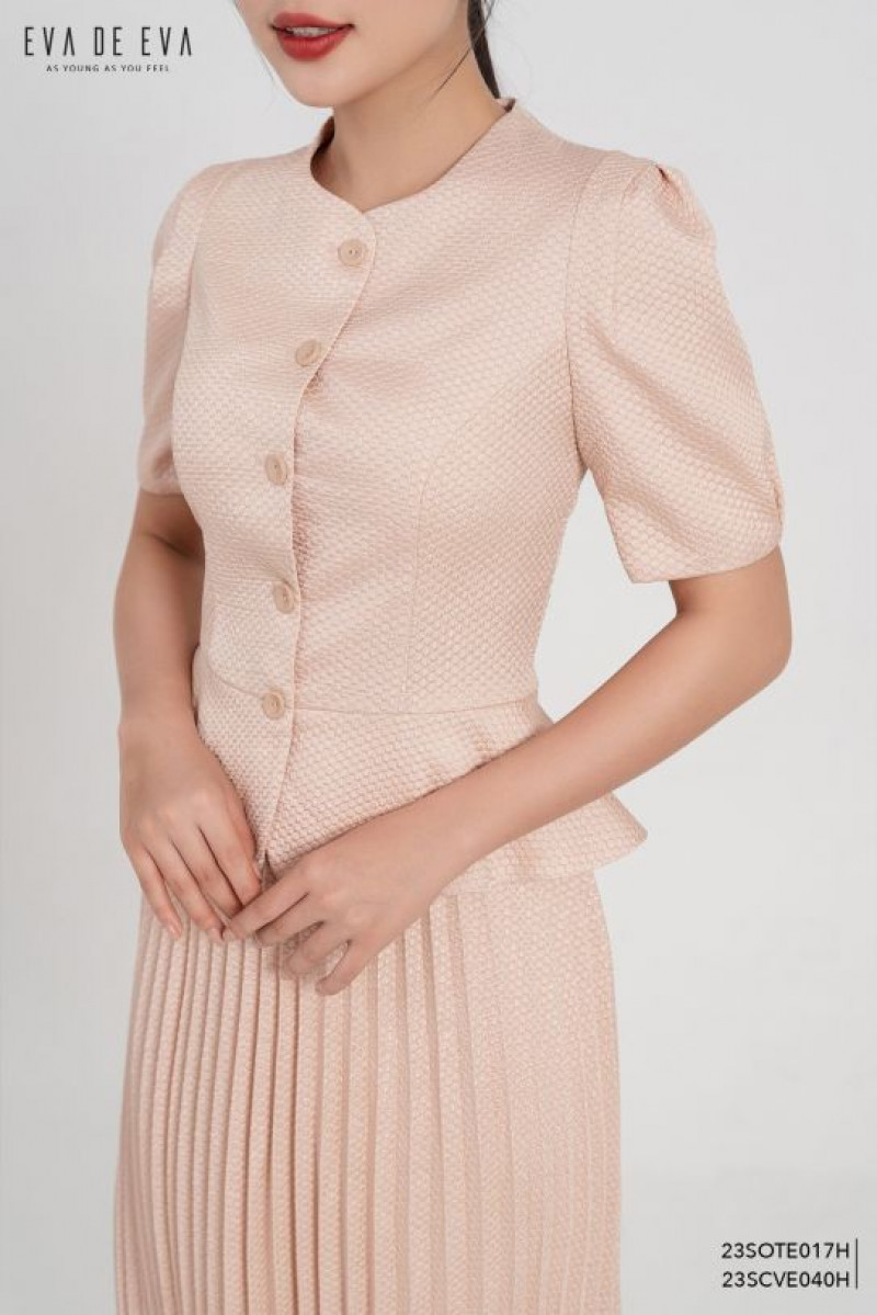 Áo kiểu cổ tròn, dáng peplum, cài cúc trước, tay nhún bồng.