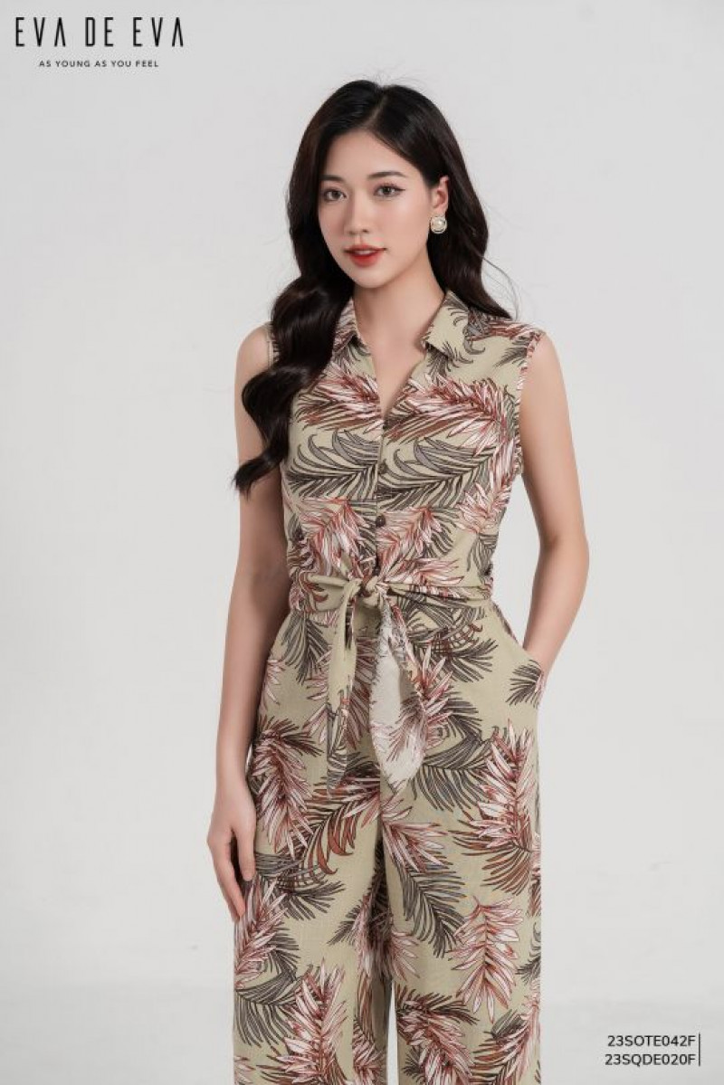 Áo kiểu phom dáng sơ mi, cổ đức, họa tiết hoa văn nổi bật, có chi tiết nơ buộc cách điệu