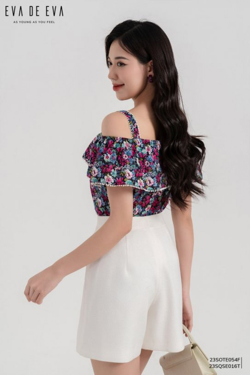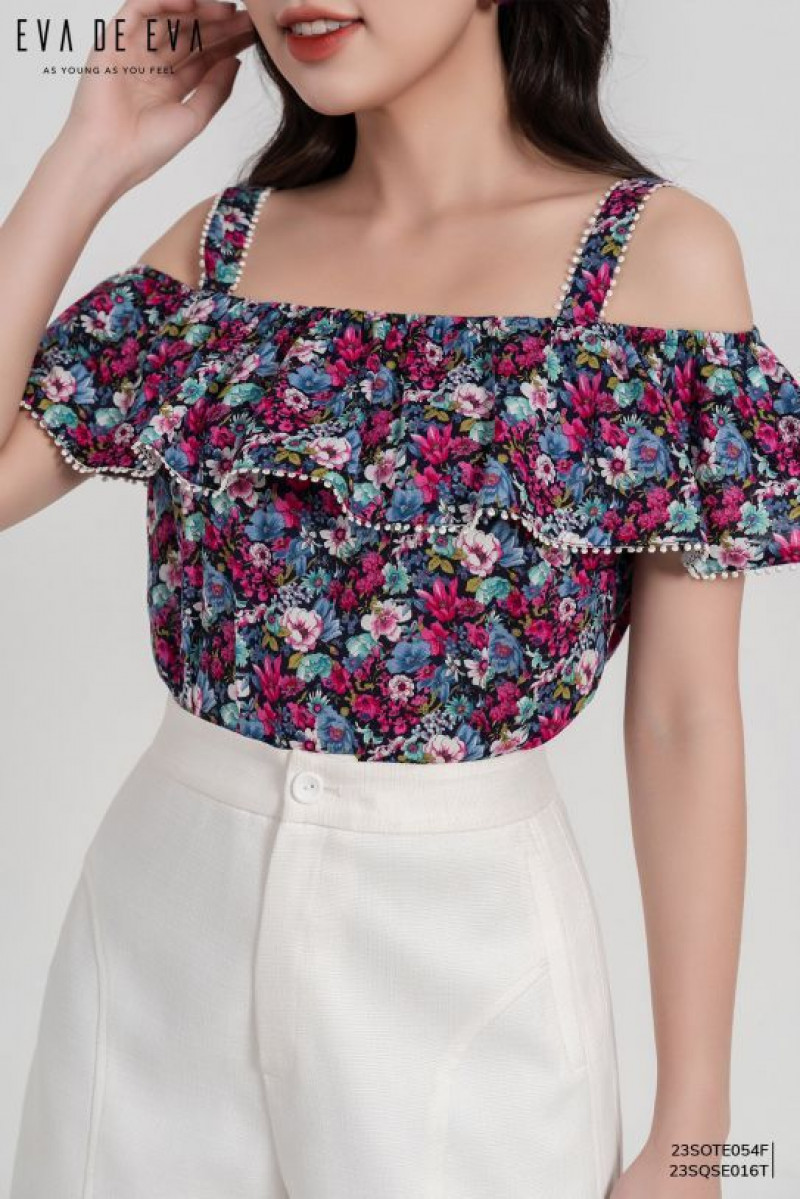 Áo kiểu trễ vai, phom dáng suông, bèo nhún trước ngực kẹp viền ren.