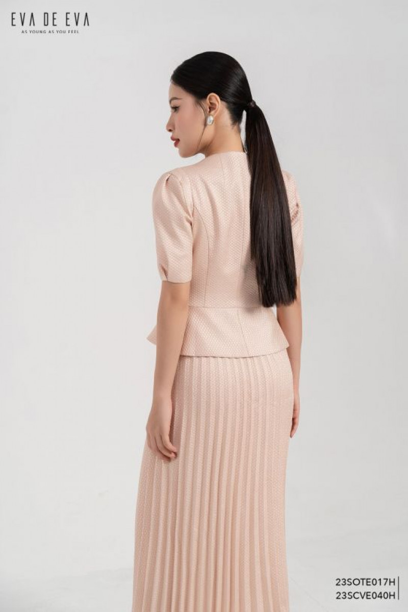 Chân váy dài qua gối xếp ly, dáng suông màu hồng.