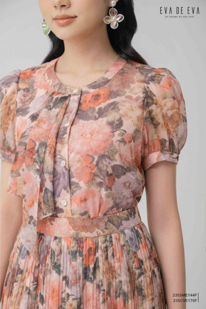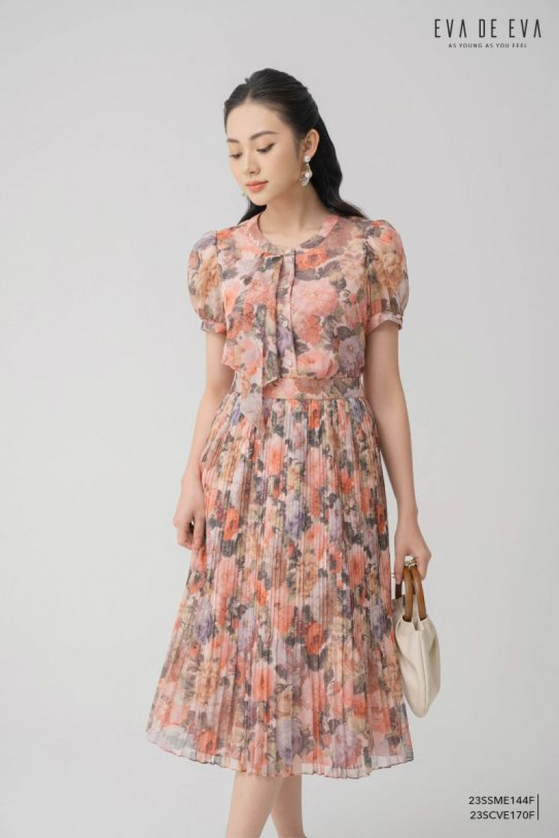 Chân váy dài qua gối xếp ly, dáng suông, họa tiết hoa nổi bật.