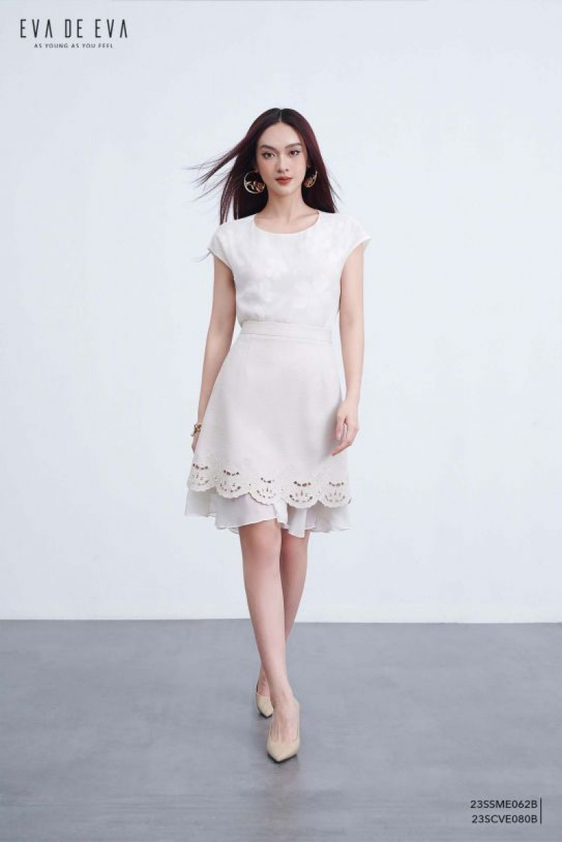 Chân váy ngang gối, dáng A trẻ trung, gấu váy phối ren nhẹ nhàng tạo điểm nhấn