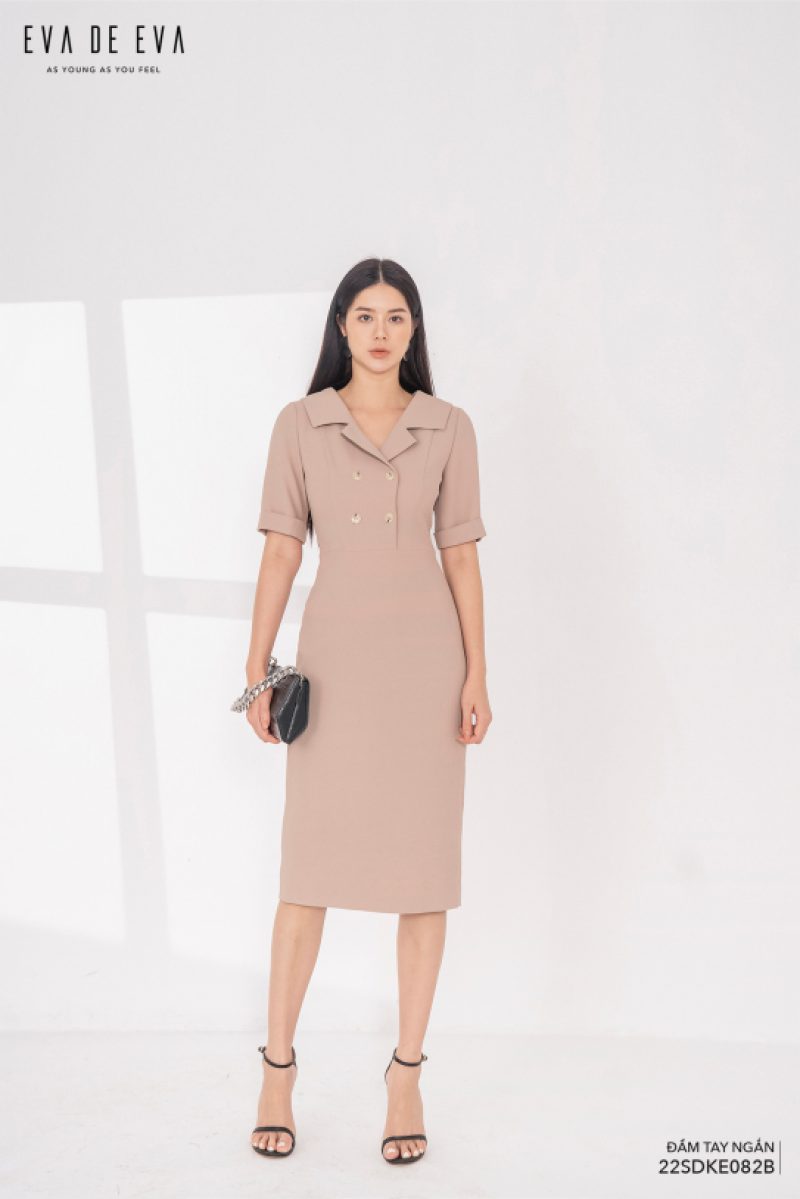Đầm sơ mi tay ngắn, phom dáng ôm, độ dài vừa phải, có chi tiết cổ vẻ lật và khuy đầm.Màu sắc: Be
