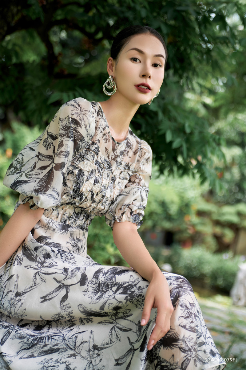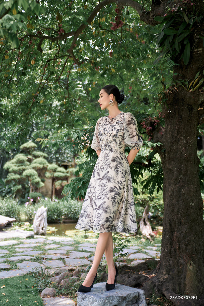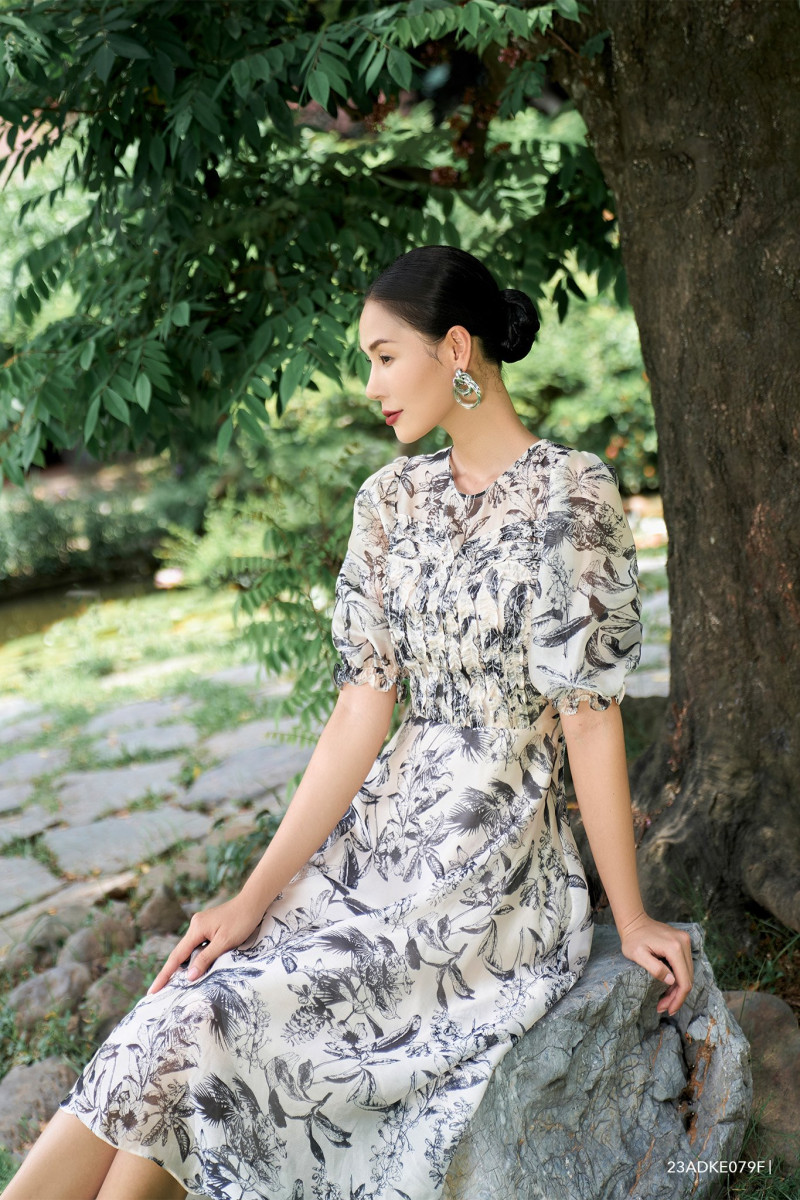 Đầm tay ngắn, dáng xòe nhẹ nữ tính, ống tay bồng tự nhiên, họa tiết hoa văn độc đáo
