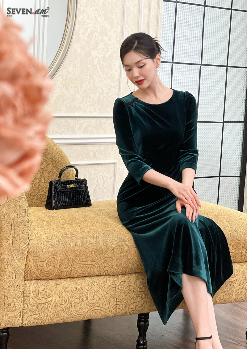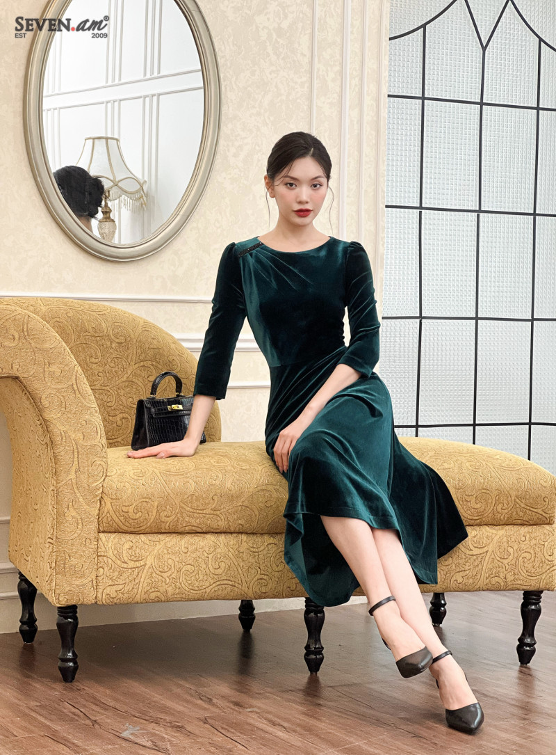 Đầm xòe tay lỡ nhung xanh vai phải xếp ly đính đá Seven.AM