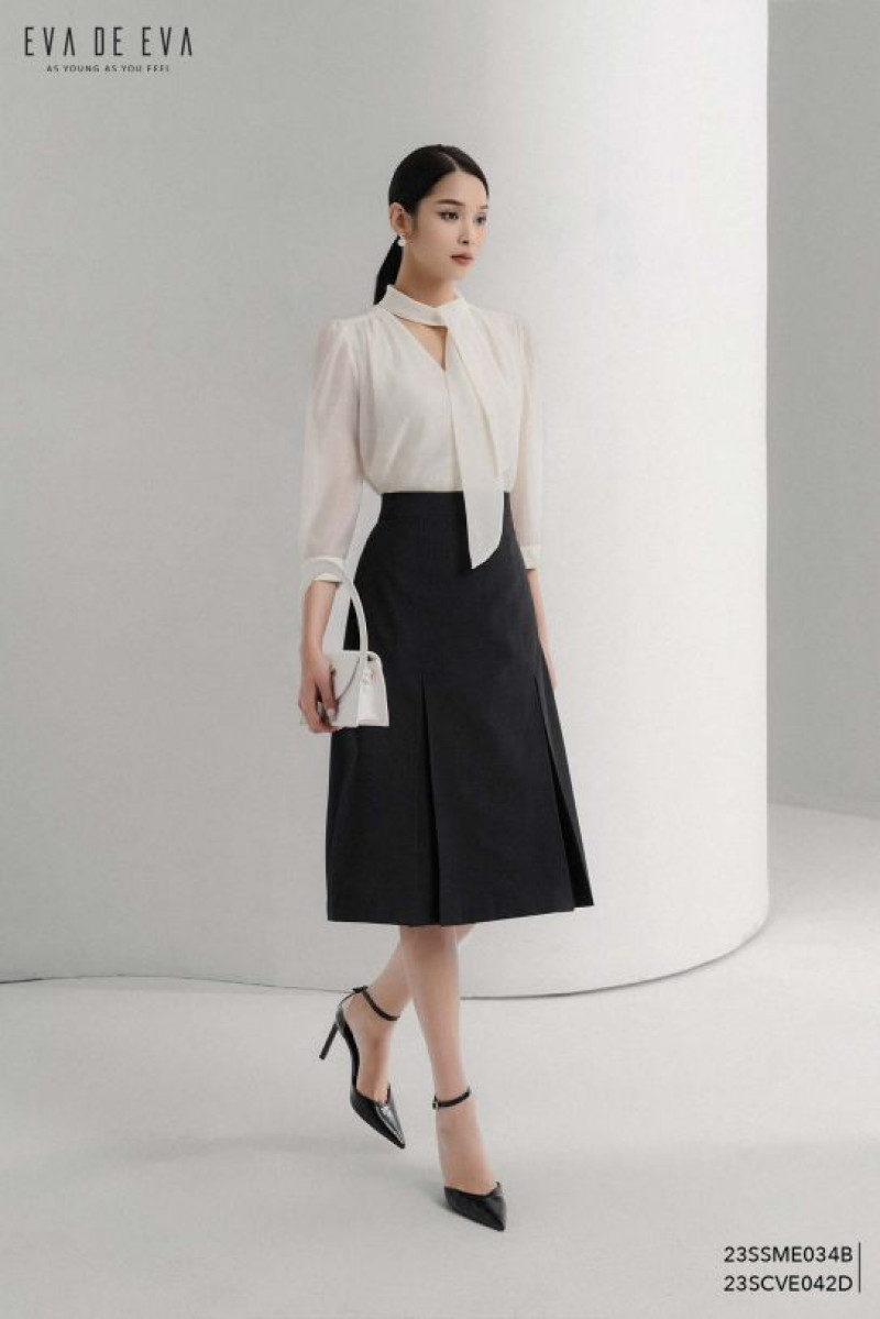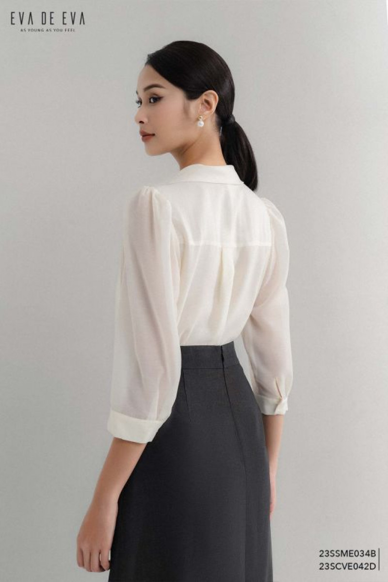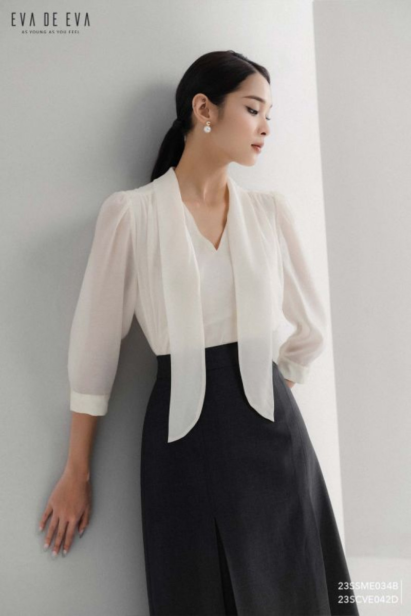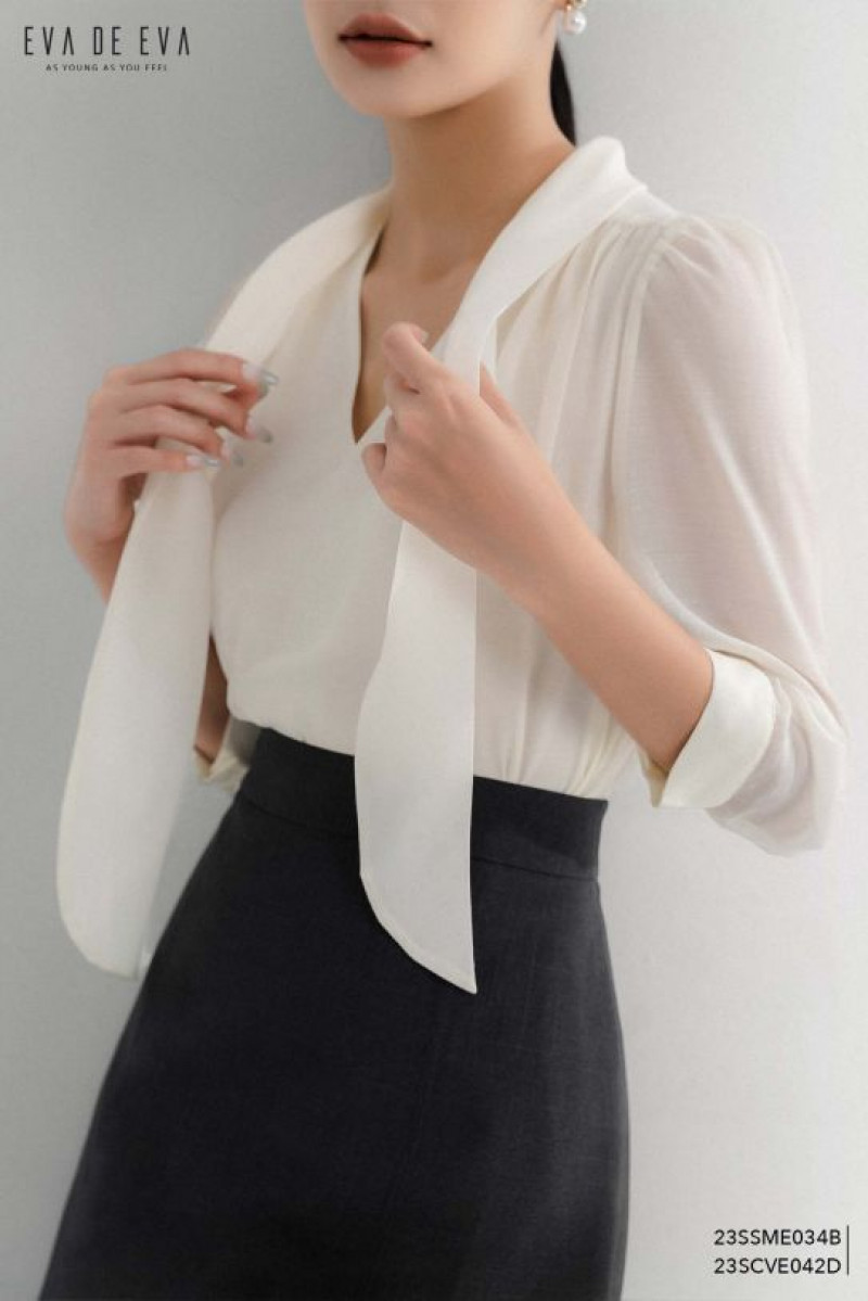 Sơ mi tay dài, cổ V, cổ có chi tiết dây nơ cách điệu