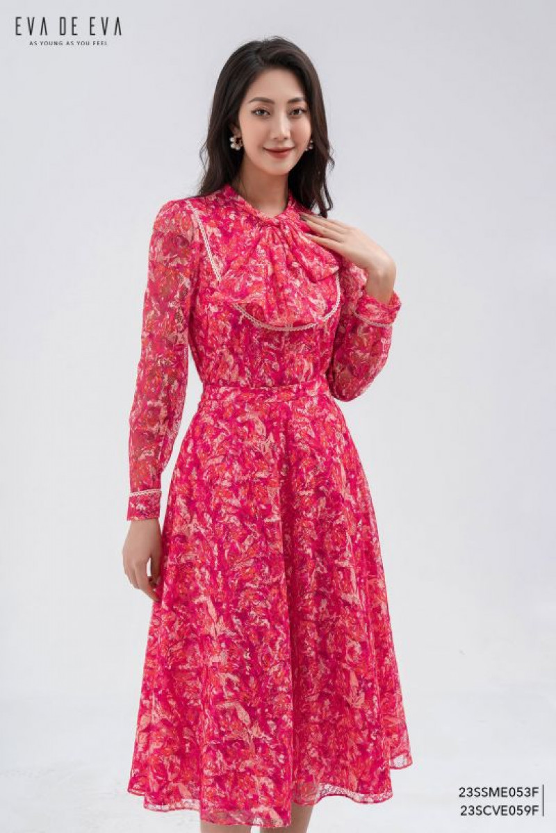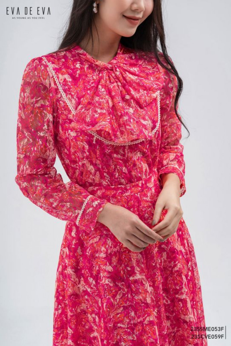 Áo sơ mi tay dài, họa tiết hoa văn độc đáo, màu sắc nổi bật, có chi tiết nơ buộc cách điệu