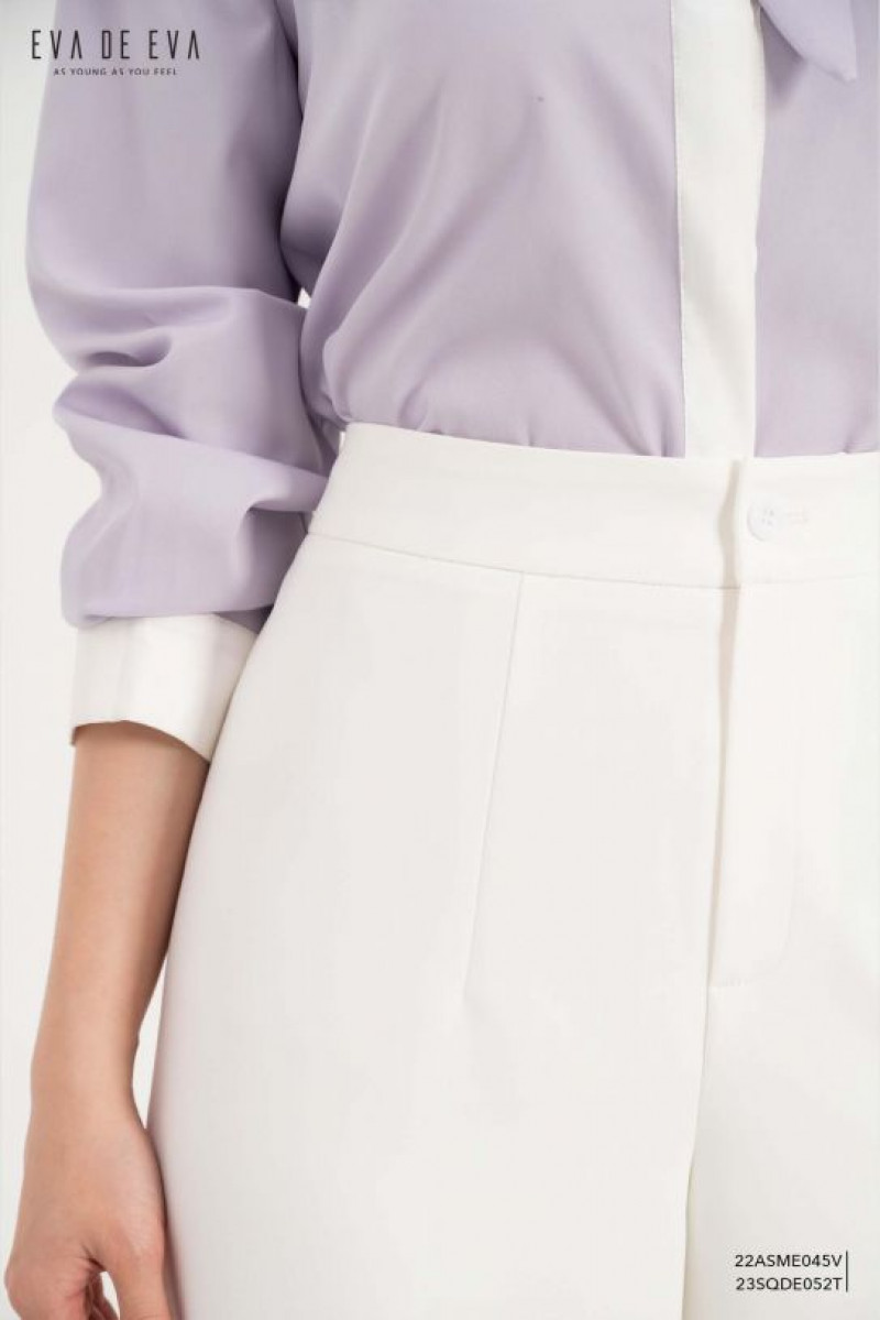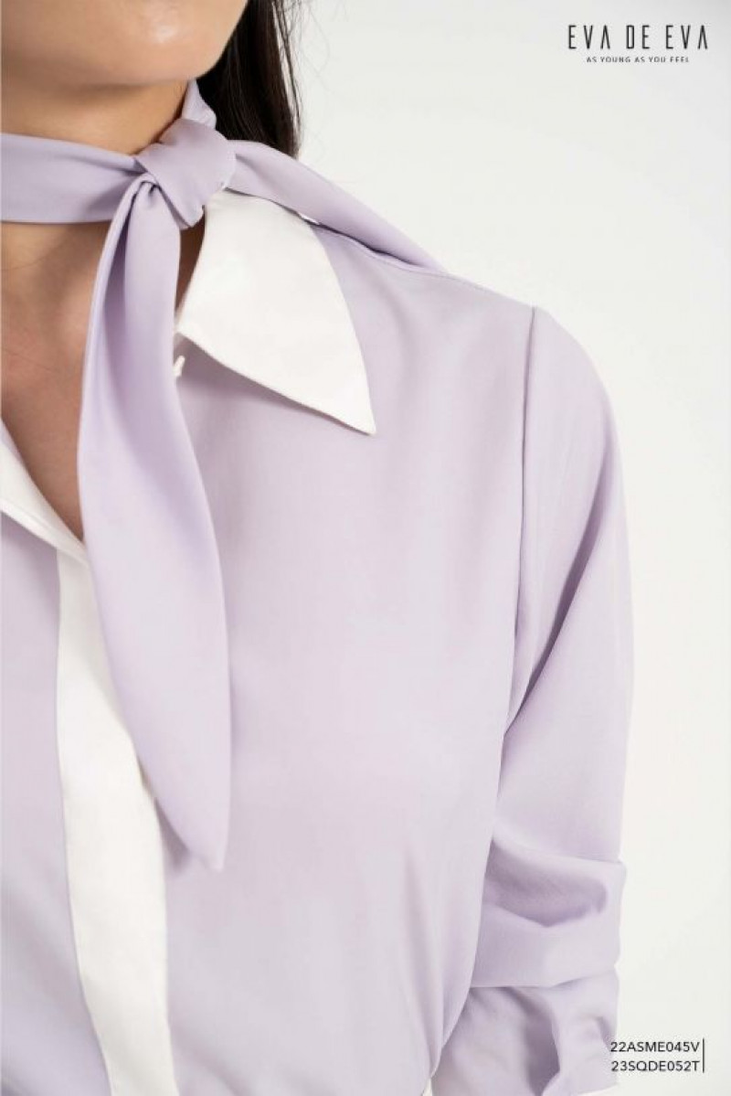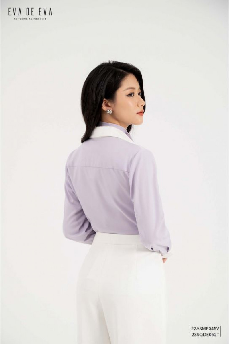 Sơ mi tay dài, phom dáng sơ vin, cổ và tay áo phối viền trắng.