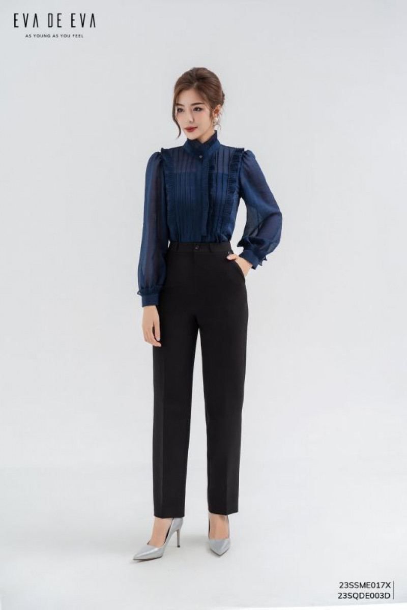 Áo sơ mi cổ tàu nằm, bèo rập tăm nhỏ trang trí tạo điểm nhấn, tay dài, cài cúc trước, kiểu dáng sơ vin.Màu sắc: Xanh