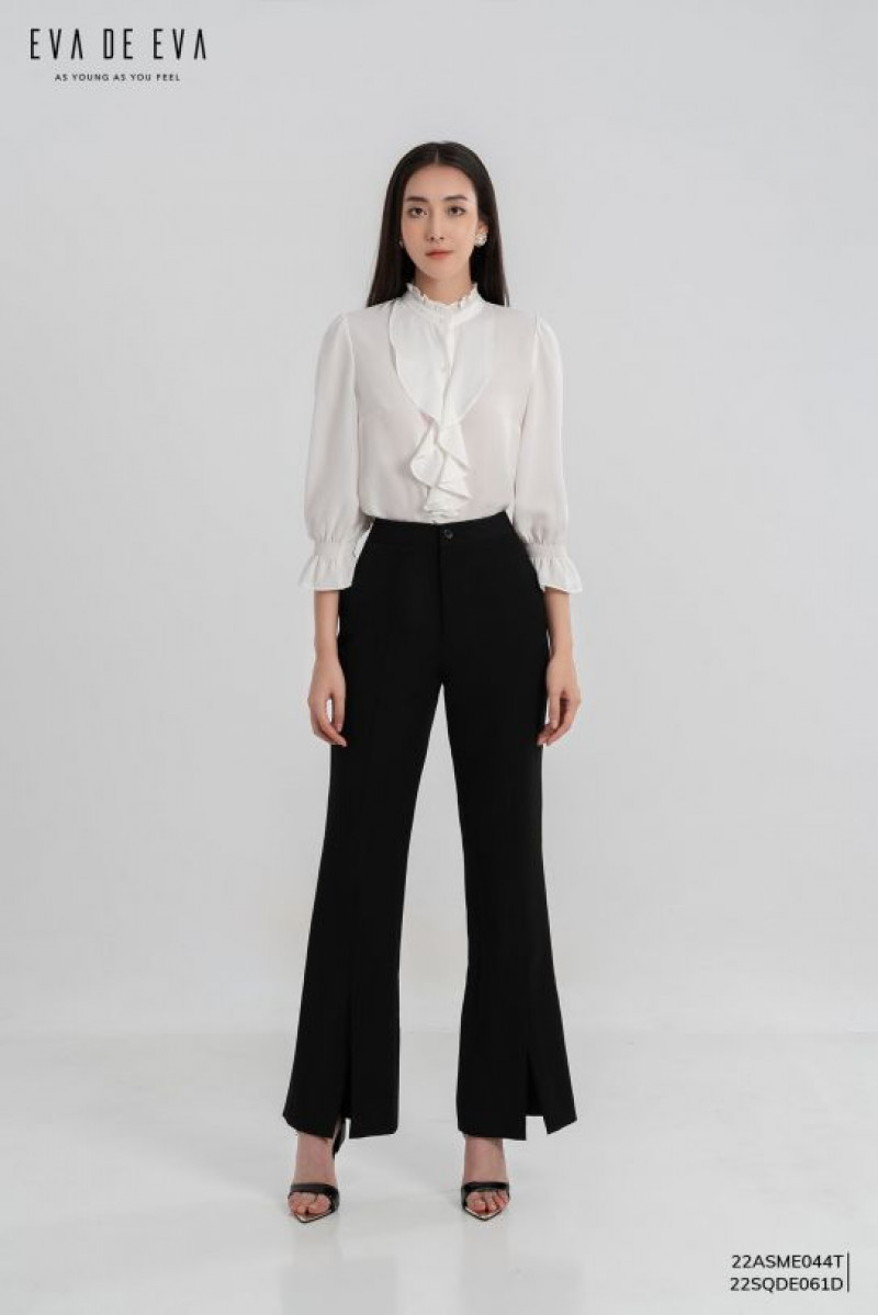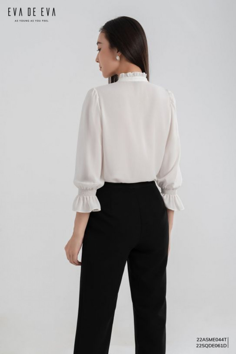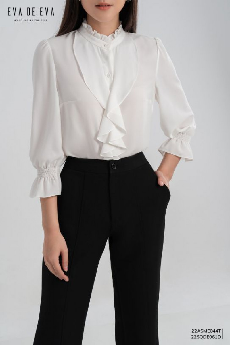 Áo sơ mi dáng suông cơ bản, cổ, tay nẹp kẹp bèo, dài tay măng sét, nẹp cúc mở trước.Màu sắc: Trắng