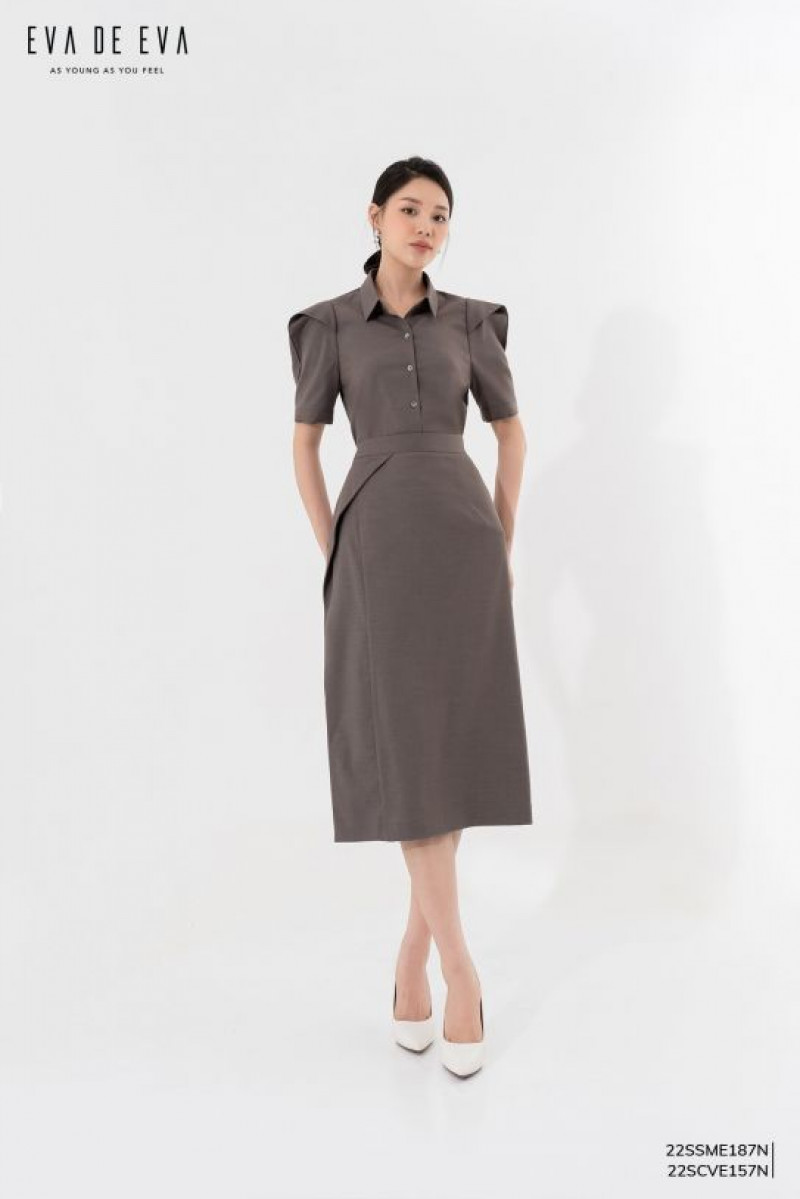 Sơ mi tay ngắn, dáng sơ vin, cổ đức có chân, có chi tiết tay xếp phồng, cài cúc phía trước.Màu sắc: Nâu