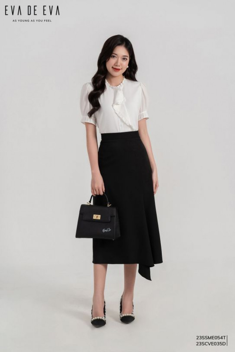 Sơ mi tay ngắn, phom dáng ôm basic, vai bồng nhẹ tự nhiên, có chi tiết bèo cách điệu