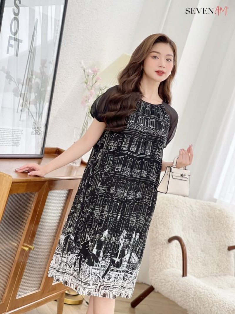 Đầm suông Sifong đen họa tiết trắng dập ly Seven.AM