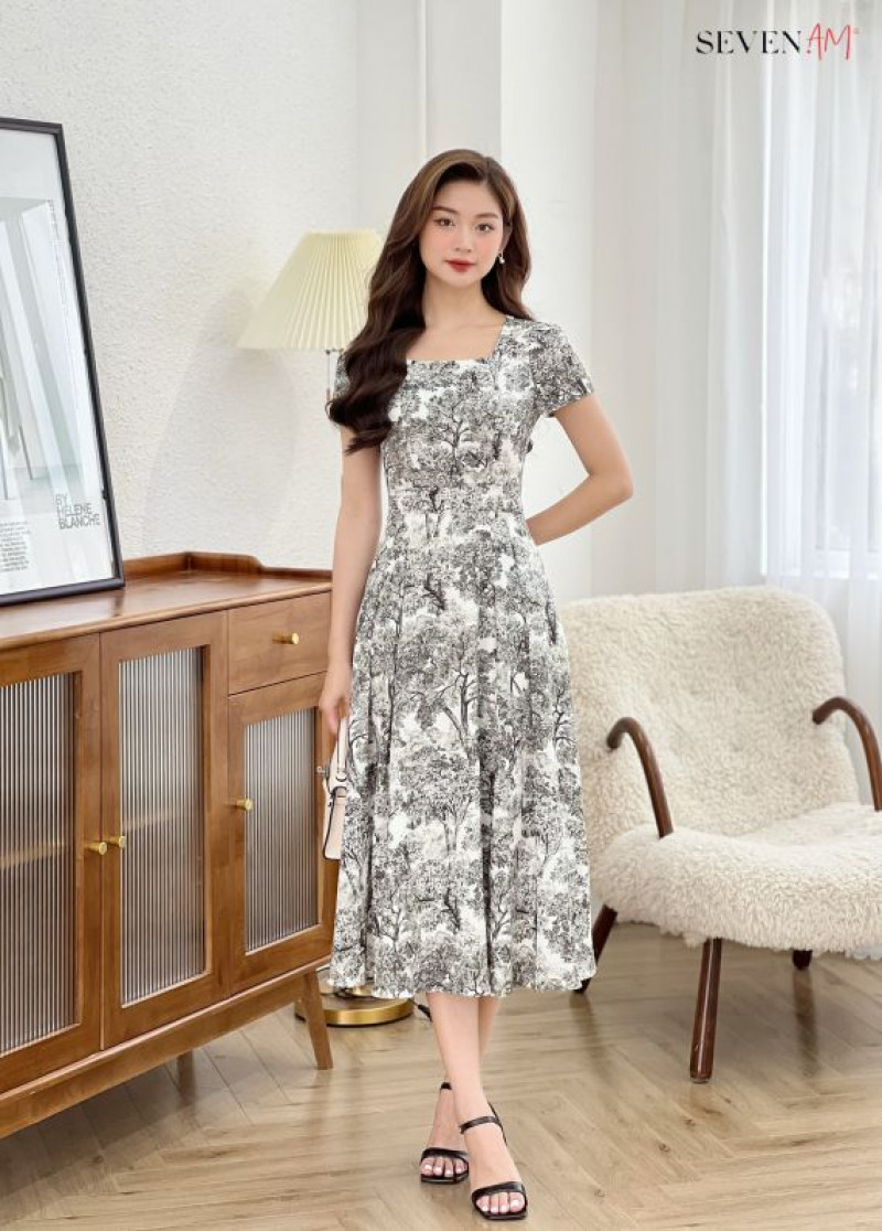 Đầm midi xoè thời trang nữ tay cộc trắng hoạ tiết Seven.AM