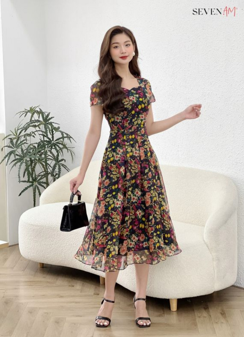 Đầm xòe tay cộc Sifong đen hoa vàng cổ vuông Seven.AM