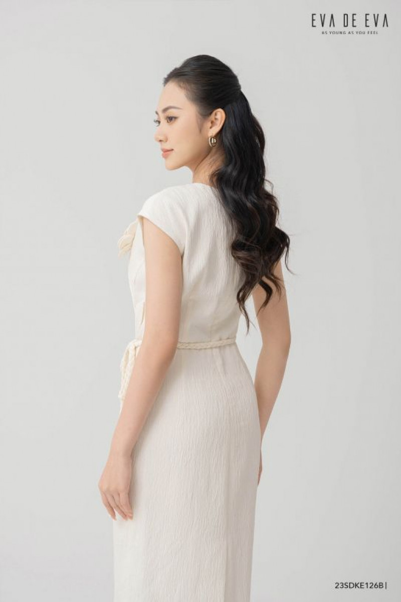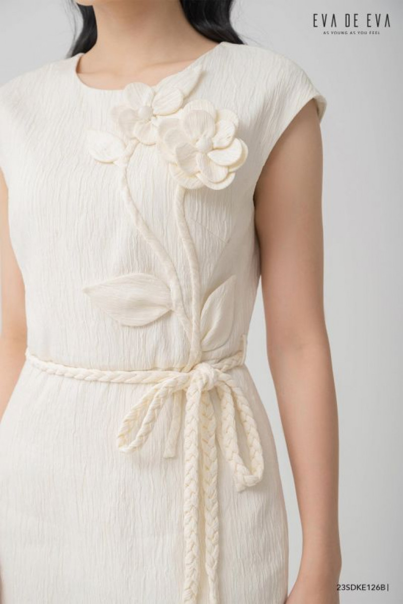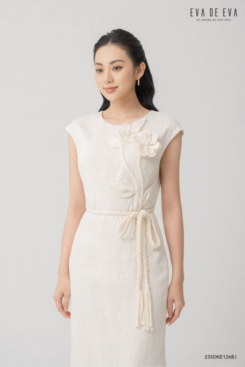 Đầm sát nách, dáng ôm, cổ tròn, chi tiết hoa trang trí cách điệu, dây tết thắt ngang eo được làm thủ công tỉ mỉ.