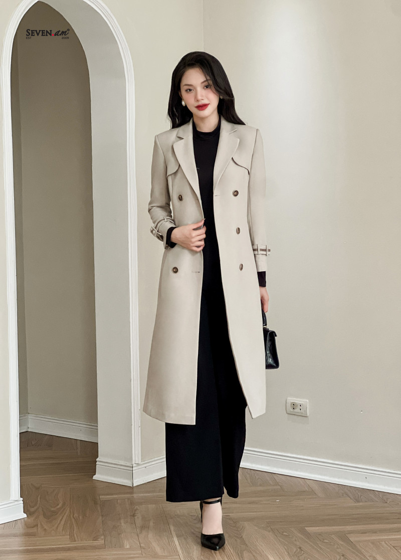 Áo khoác măng tô dài be cổ 2 ve dây đai eo ốp duy băng Seven.AM