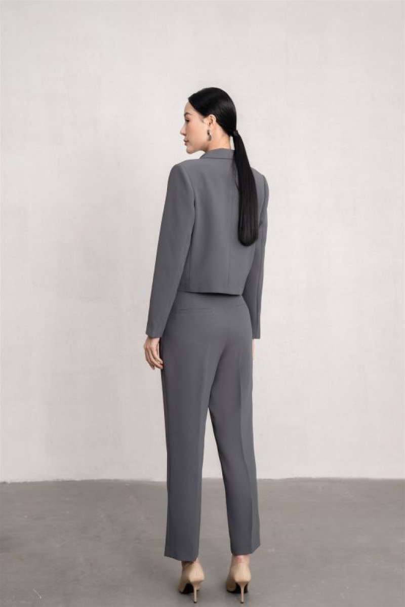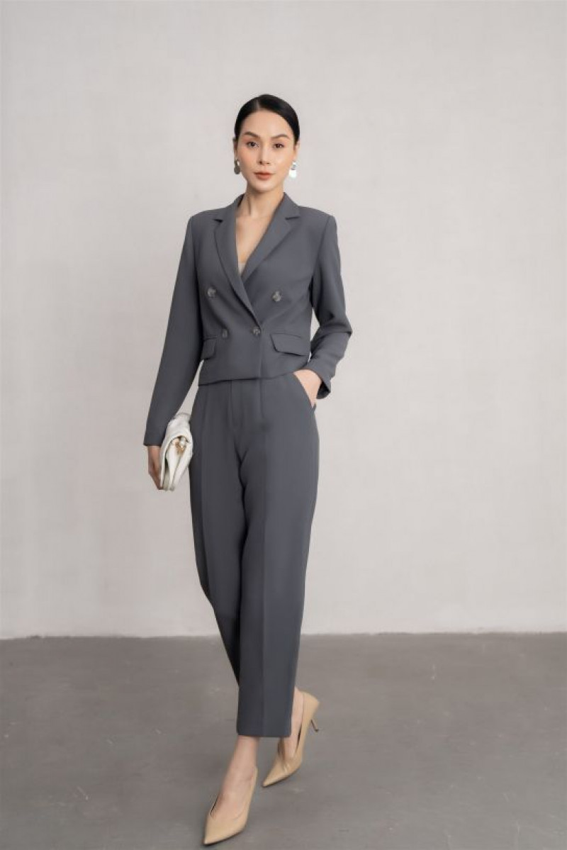 Áo blazer phom dáng lửng, cổ áo lật, có 2 hàng khuy trang trí.