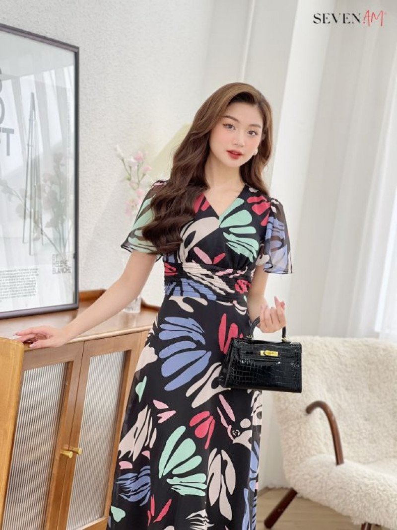 Đầm midi sifong đen họa tiết tím xanh cổ V xếp ly eo Seven.AM