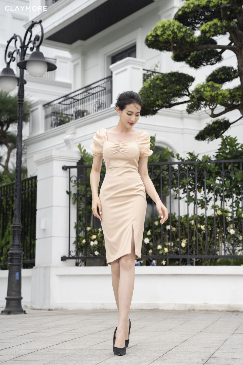 Đầm ôm nhún ngực tay phối-CFDBS211413