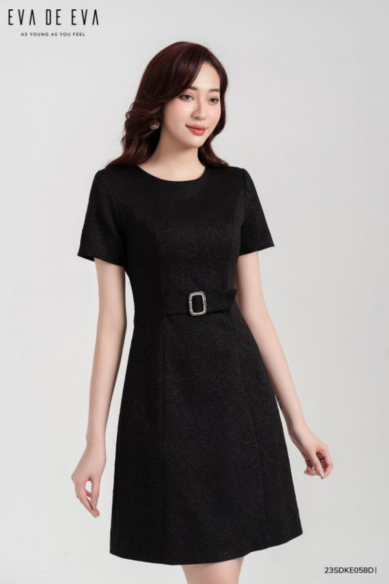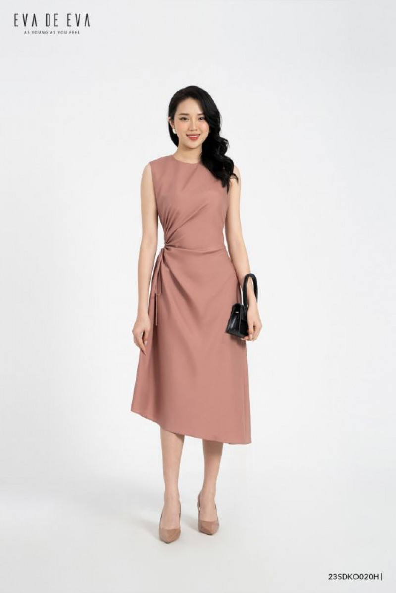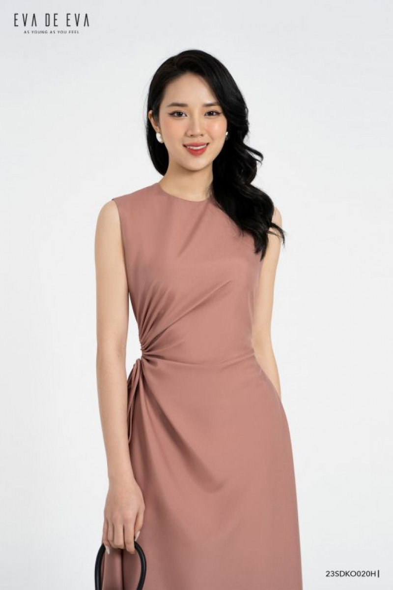 Đầm dáng suông có ôm eo nhẹ, chi tiết rút nhún lệch 1 bên eo, cổ tròn, dáng bất đối xứng.