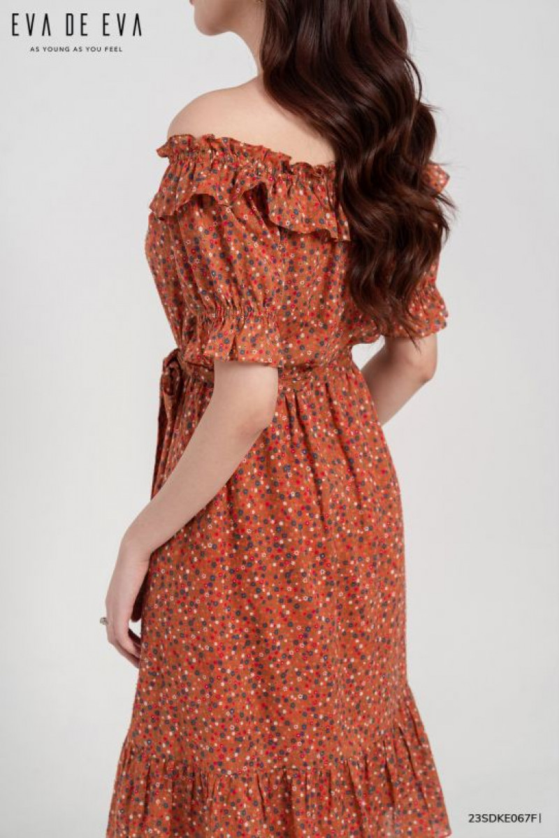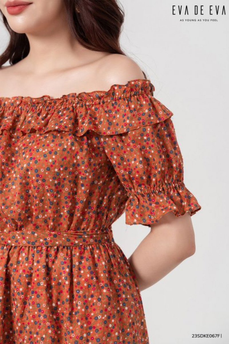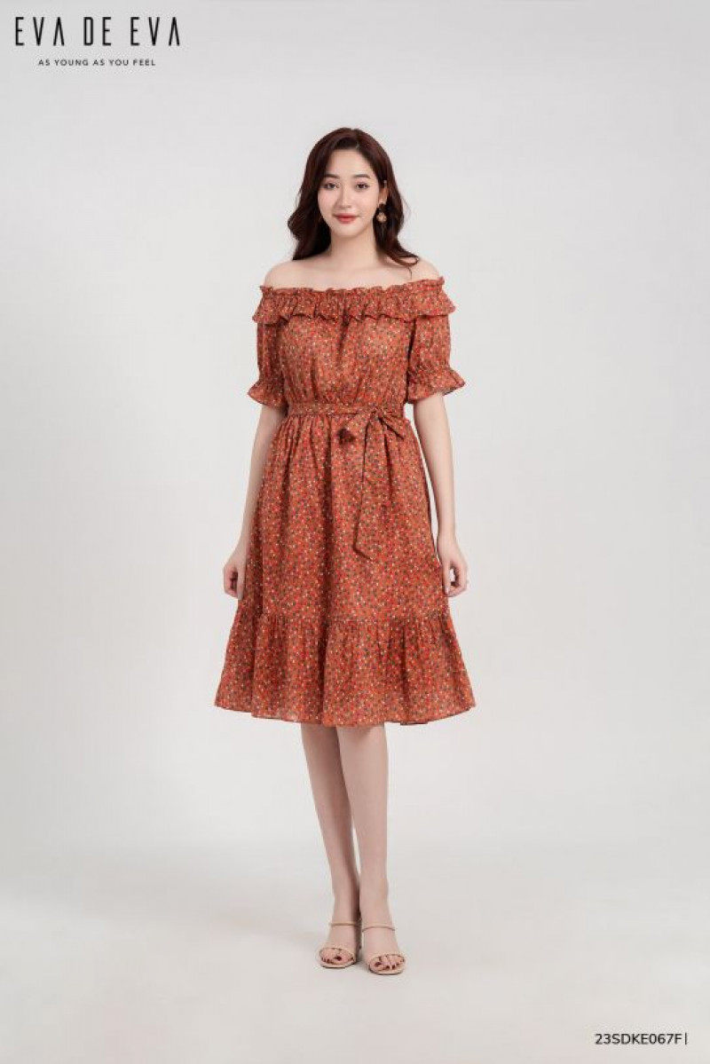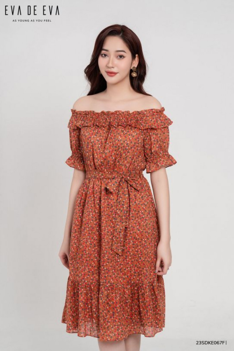 Đầm trễ vai, dáng thắt eo, tay bồng nữ tính.