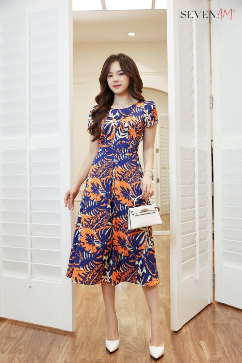 Đầm xòe tay cộc lụa xanh lá cam cổ tròn Seven.AM H633316D
