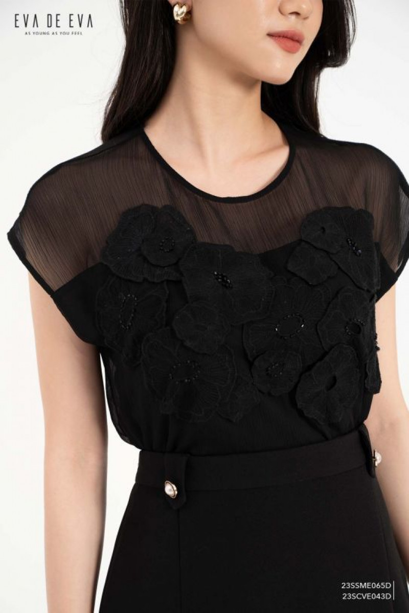 Sơ mi tay ngắn, dáng sơ vin, phần thân trước thêu hoa đắp nổi, đính hạt trang trí.